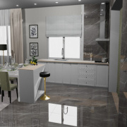 Керамогранит Grigio Fresco – высокоточная имитация одноименного турецкого мрамора с прохладным и сдержанным характером. Величественный и монументальный, он играет переходами от серого оттенка к графитовому, разбавляя свой неоднородный фон хаотичными серебристыми прожилками. Grigio Fresco заслуженно привлекает к себе всеобщее внимание.