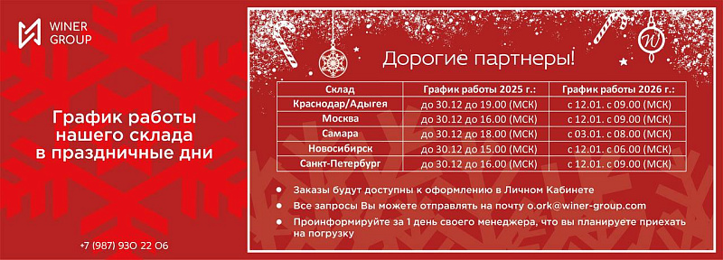 В преддверии новогодних праздников информируем вас о графиках работы наших складов. Мы приложим все усилия, чтобы ваш бизнес продолжал работать без перебоев даже в праздничные дни.