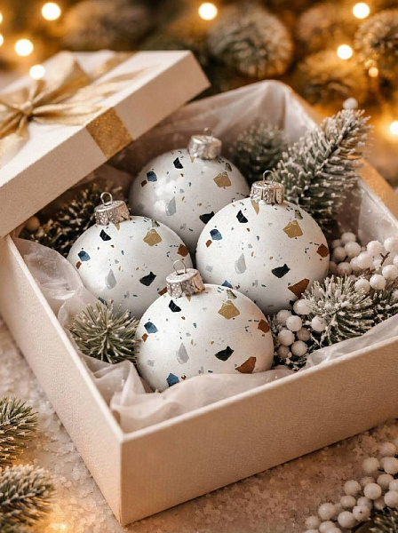И теперь нейросеть с нами согласна! Она увидела в наших коллекциях не только полы и стены, а... идеальные ёлочные игрушки. Смотрите, как технология визуализировала этот праздничный взгляд на нашу плитку