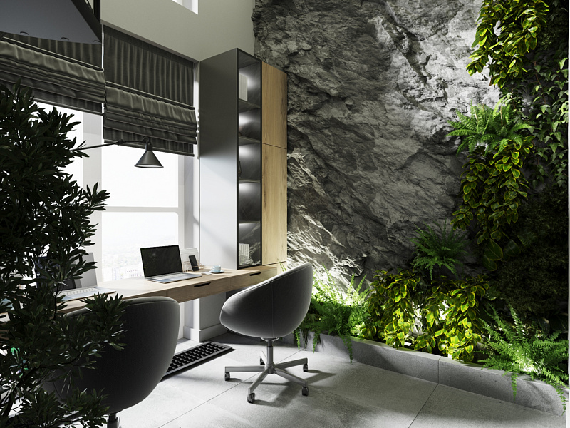 Весь проект выполнен в строгих, несколько "мужских" сочетаниях цветов. Вместе с нейтральными оттенками камня, я использовала небольшие вкрапления акцентных цветов для добавления глубины и выразительности пространства. Основой кабинета и зоны отдыха является выразительная каменная стена с высаженными растениями (в зоне доступа живые, вне доступа имитация компании Real Touch). Для покрытия пола мне были необходимы природные нейтральные оттенки. Фоновый керамогранит должен был гармонично вписываться в общий концепт пространства. Лучшим вариантом мне показался керамогранит Cementare Manatee 600х1200мм MATT. Заказчику очень понравилось предложенное сочетание и проект подписали с первого просмотра.