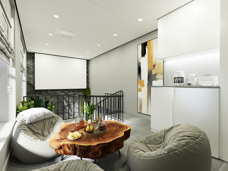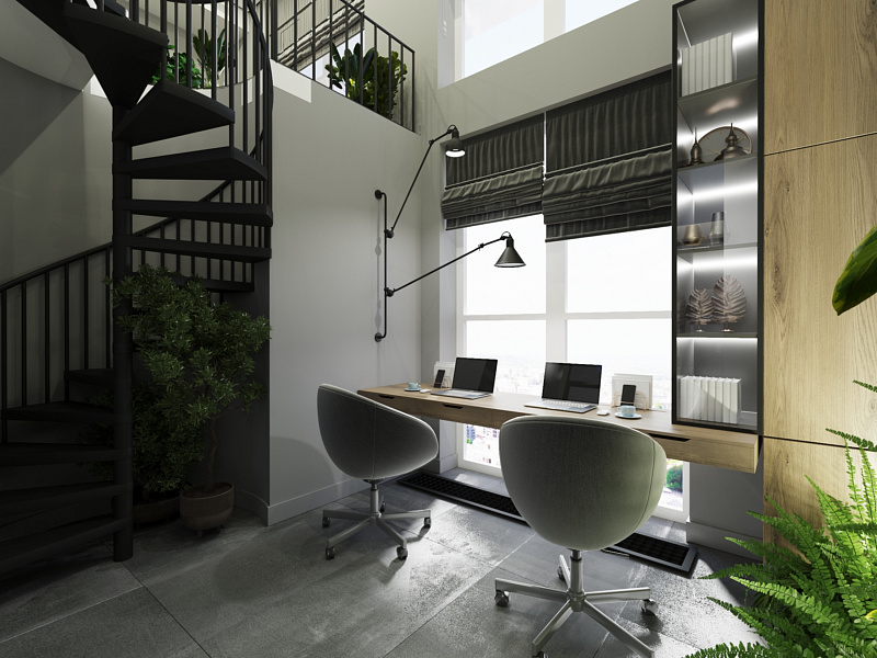 Частный жилой интерьер квартиры со вторым светом в многоквартирном доме в г. Ульяновск. На данный момент приступили к ремонтным работам на объекте. Представлена визуализация: кабинет для двух человек и зона отдыха на втором этаже.