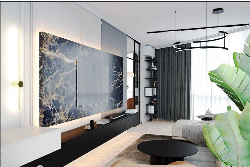 Представлен проект гостиной в сочетании темного мрамора.