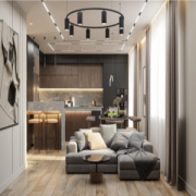 Дизайнером был разработан проект квартиры в г. Тамбов. В зоне кухни удачно был использован Керамогранит Lilac Grey ENNFACE (600х1200), светло графитовый оттенок разбавил темную кухню.