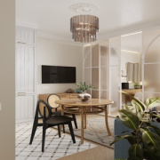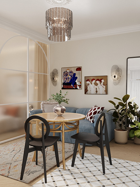 Небольшие, но очень продуманные и уютные апартаменты общей площадью 36,7 м². Здесь каждая деталь на своём месте, всё гармонично сочетается, а главная идея — создать комфортное и эстетичное пространство для молодой девушки 21 года, утончённой, с тонким вкусом и чётким пониманием, чего она хочет от своего интерьера.