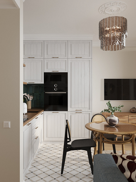 Интерьер выполнен в светлых, мягких тонах с акцентами на натуральные материалы. Белые фасады кухни с вертикальной фрезеровкой придают лёгкость и не перегружают пространство. Рабочая зона оформлена плиткой с живыми бирюзово-синими оттенками, которая отсылает к средиземноморскому стилю и красиво контрастирует с деревянной столешницей и чёрной фурнитурой.