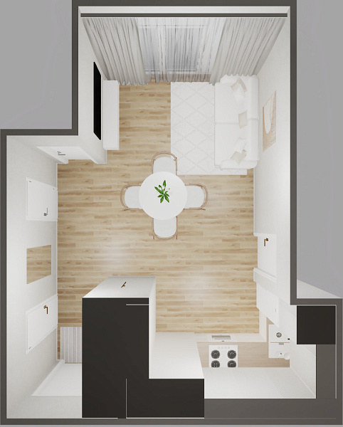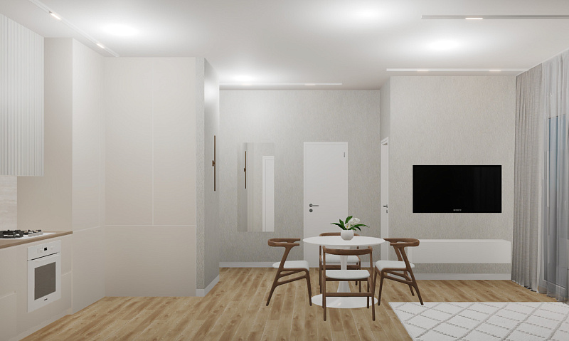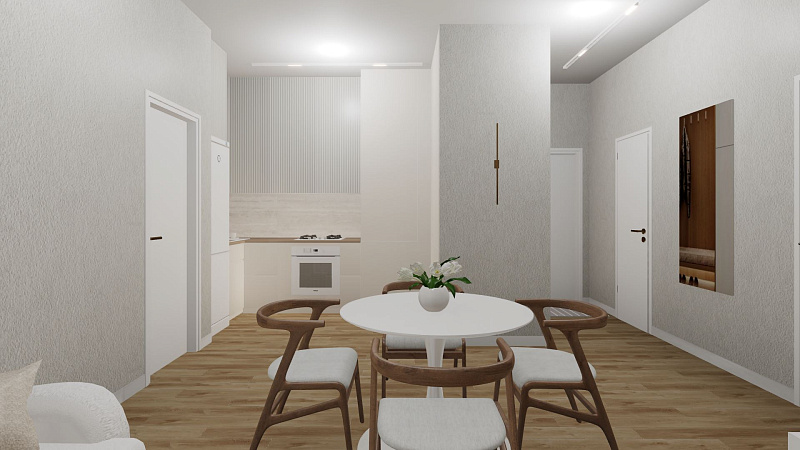 Дизайн проект светлой кухни представляет собой гармоничное объединение функциональности и эстетики. Пол, выполненный из SPC, отличается своей прочностью и долговечностью, заказчик оценил тепло дерева Alder Golden 181х1220х4мм MATT. Его текстура и цветовая палитра прекрасно сочетаются с остальными элементами интерьера, создавая атмосферу уюта и комфорта.