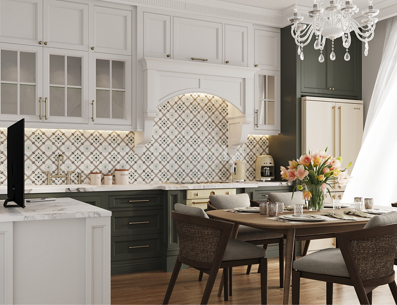Дизайн-проект кухни из проекта квартиры "Mon plaisir". На фартук для кухонного гарнитура был использован керамогранит - Ponza Bloom Matt 200x200x8. В качестве напольного покрытия использован керамогранит - Oakland Ginger 200х1200мм MATT+RELIEF.