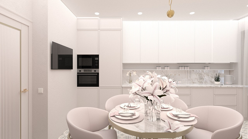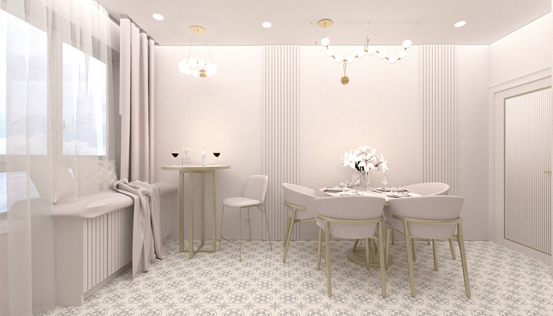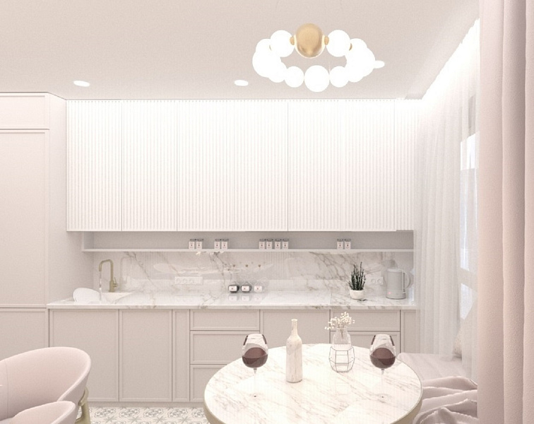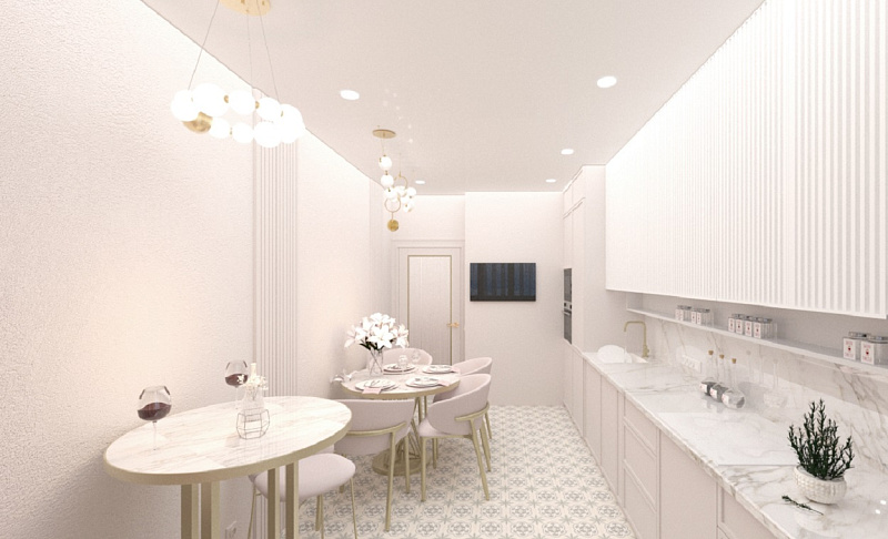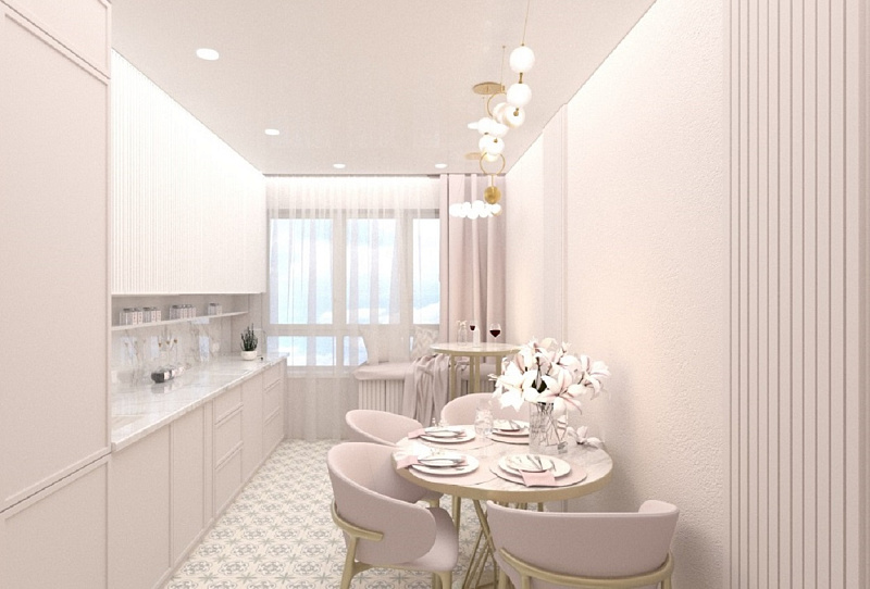 На кухне предусмотрен теплый пол и мягкий подоконник с высоким столом, за которым она планирует пить горячий кофе по утрам, любоваться видами из окна, окутывая себя теплотой вокруг, а вечерами в приятной атмосфере наслаждаться бесподобными закатами, возможно даже с бокальчиком красного сухого.