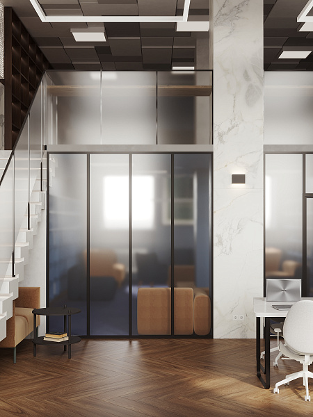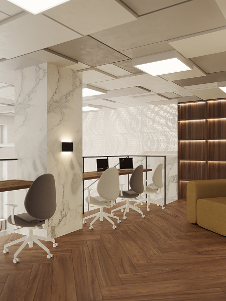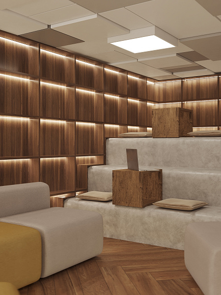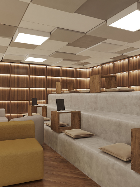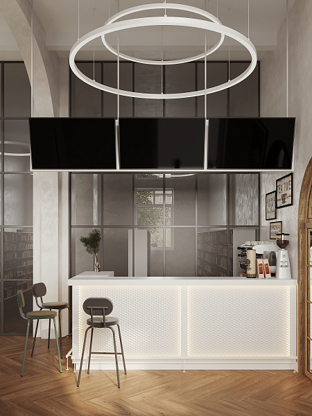 Внутреннее пространство библиотеки мы организовали как многослойный ландшафт, где каждый найдет свое место. Просторный вестибюль с зоной для кофе и общения приглашает к неформальным встречам. Компьютерный зал с большим общим столом и уединенными будками для переговоров создает баланс между коллективной работой и приватностью. Антресоль, парящая над основным пространством, предлагает тихий уголок для погружения в мир книг. Актовый зал, готовый к проведению мероприятий, и уютный коворкинг дополняют функциональность пространства. Для самых маленьких читателей мы создали отдельную детскую зону, где сказка и знания переплетаются воедино.