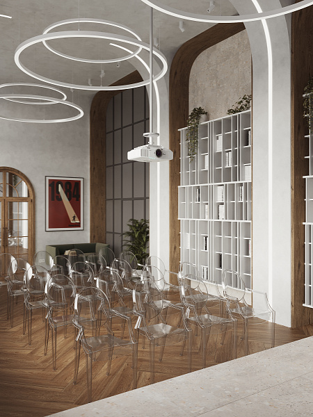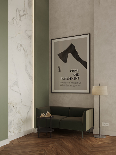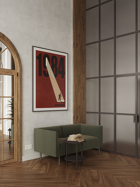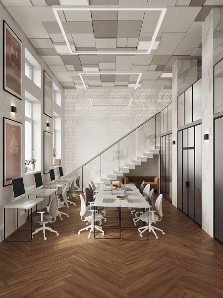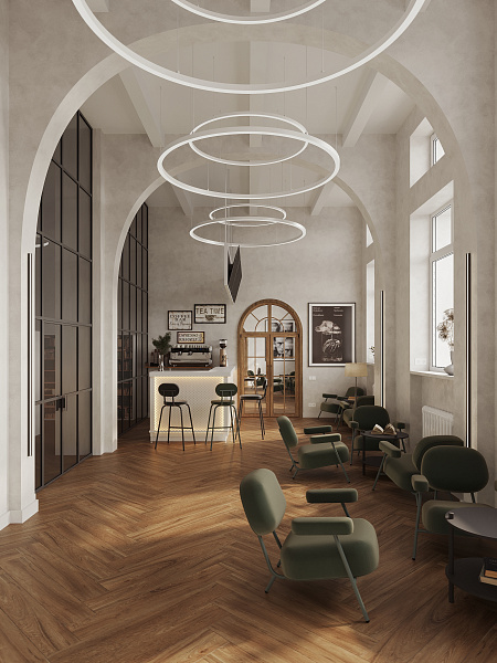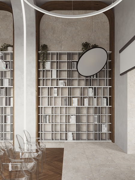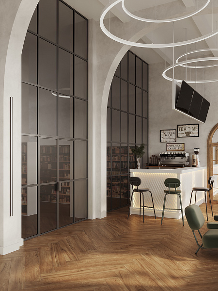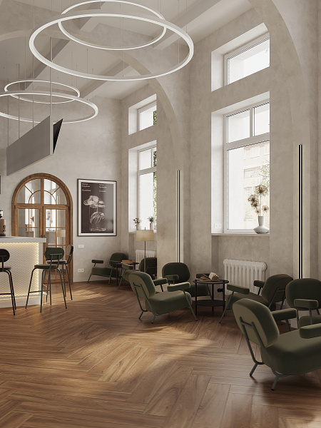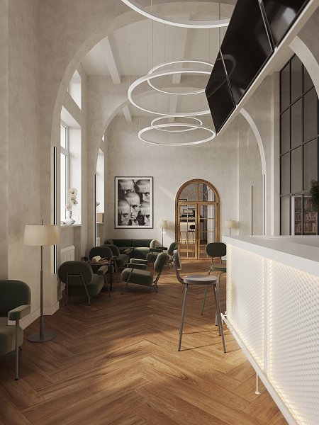 Библиотека разместилась в сталинском доме 1958 года, и в своем дизайне мы постарались сохранить дух эпохи, ее практичность, функциональность и минимализм. Однако, учитывая современные требования к общественным пространствам, мы выбрали материалы, сочетающие в себе эстетику и износостойкость. Керамогранит под дерево Oakland Ginger 200х1200 мм MATT+RELIEF от ENNFACE, уложенный классической елочкой, стал основой интерьера, добавляя ему теплоту и элегантность.