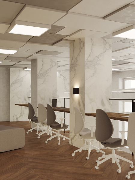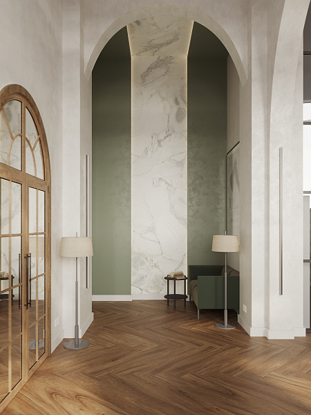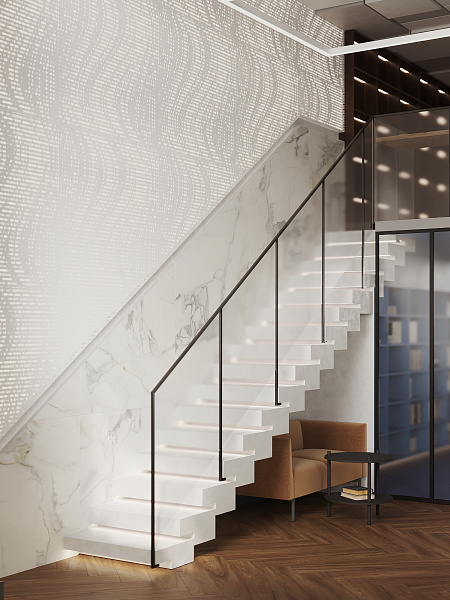 Акценты в интерьере расставлены с помощью белого мрамора (Pacific White 1200х2800х6 SP Matt, керамогранит ENNFACE) и венецианского терраццо (Venetian Stone 600х1200 мм Carving, керамогранит ENNFACE). Эти материалы, словно легкие мазки художника, придают пространству легкость, изысканность и воздушность, не перегружая его, но подчеркивая его архитектурную гармонию.