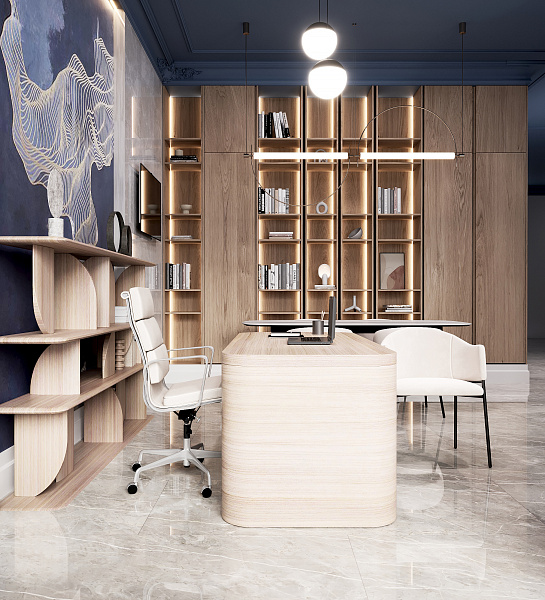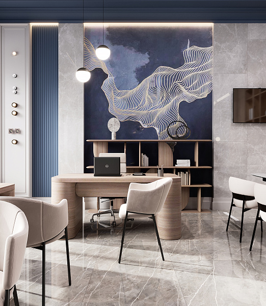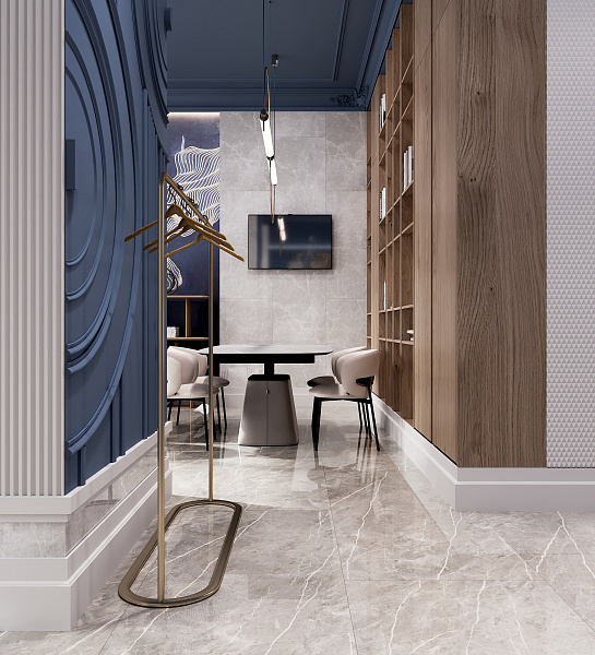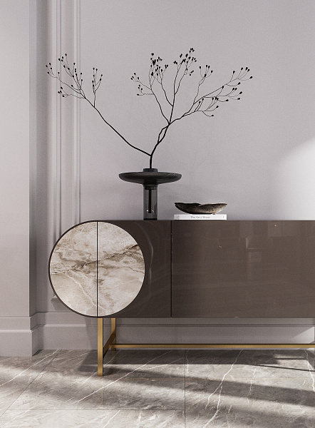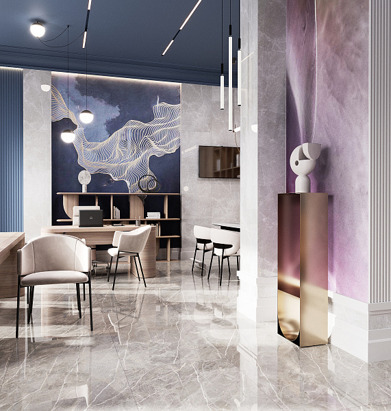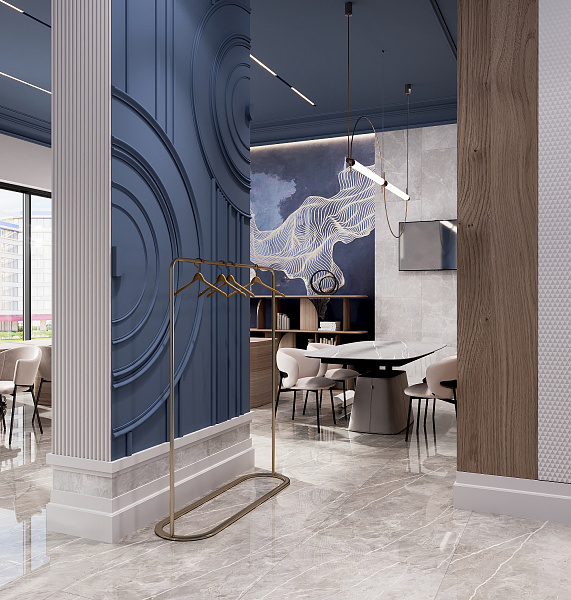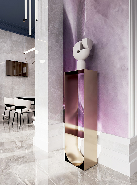 На полу крупноформатный керамогранит: Marcasite 800х1600х9 HIGH GLOSSY, ENNFACE.
