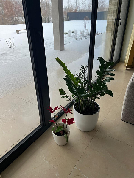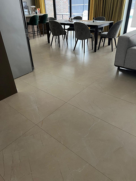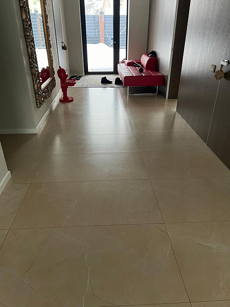 Сердцем дома стал просторный холл, где свет, льющийся сквозь панорамные окна, играет на матовой поверхности керамогранита Crema Luna. Его мягкий кремовый оттенок создает ощущение тепла и уюта, гармонично перекликаясь с общей цветовой палитрой интерьера.