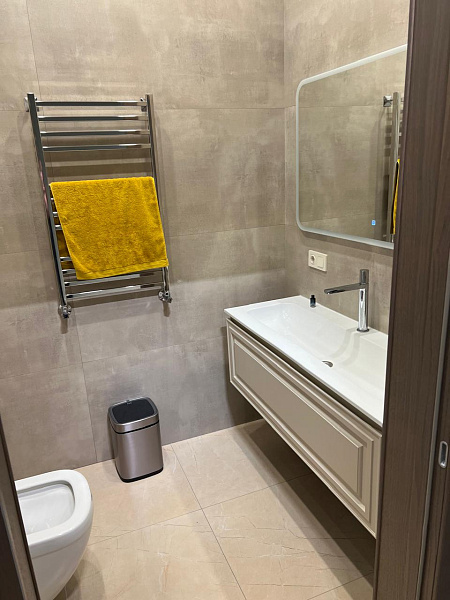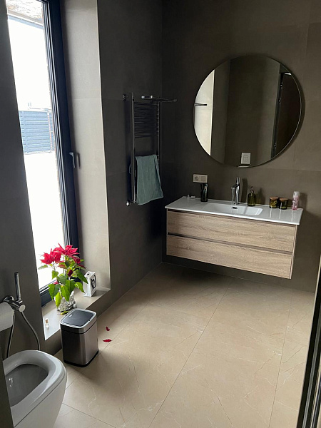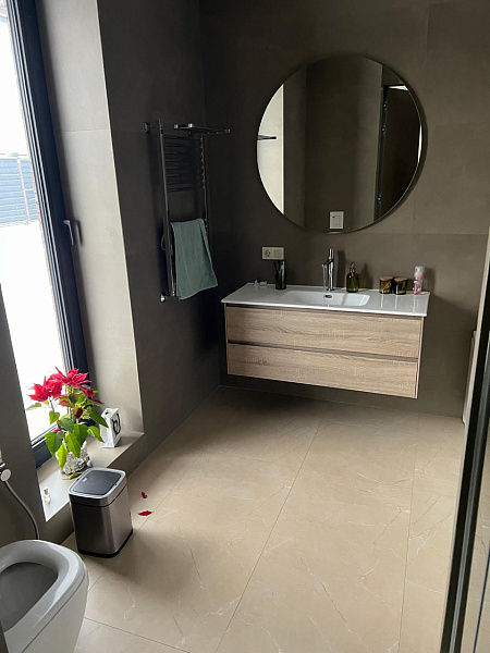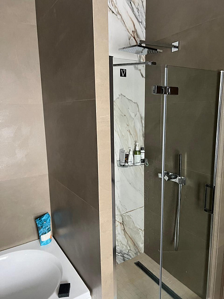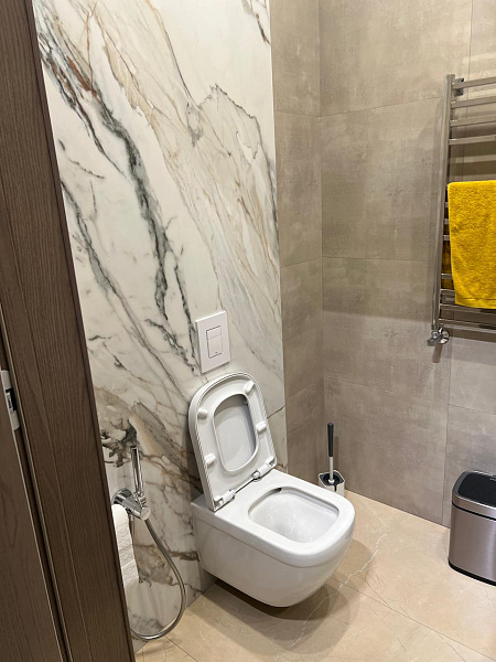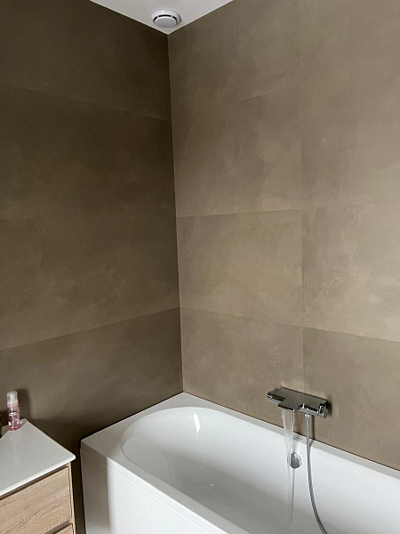 В ванной комнате и санузле царит атмосфера элегантности и сдержанности. На стенах доминирует керамогранит Monolith Burly, имитирующий текстуру натурального камня. Контрастным акцентом выступает Cementare Peach, добавляя нотку тепла и оригинальности.