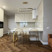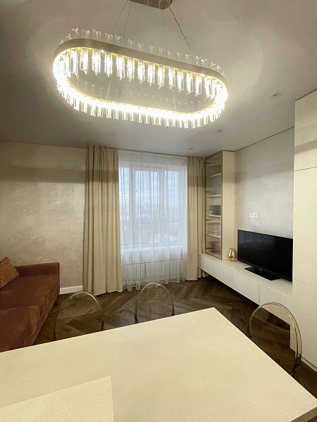 На фотографиях представлена кухня-гостиная из реализованного проекта 2‐комнатной квартиры в ЖК Панова Парк.