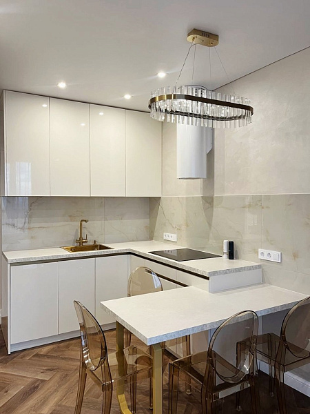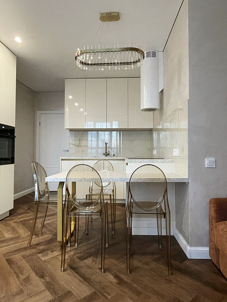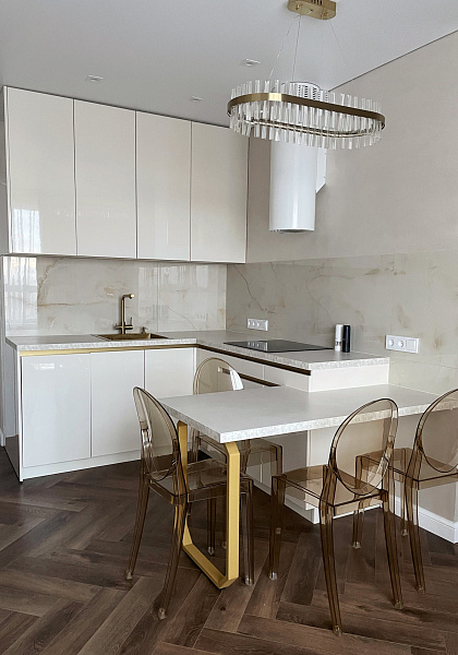 Глянцевые поверхности, использованные в проекте, отражают пространство и делают его объёмным. Чтобы помещение смотрелось более просторным, мы выбрали полупрозрачные стулья из цветного пластика. По тональности они совпадают с жилами керамогранита.