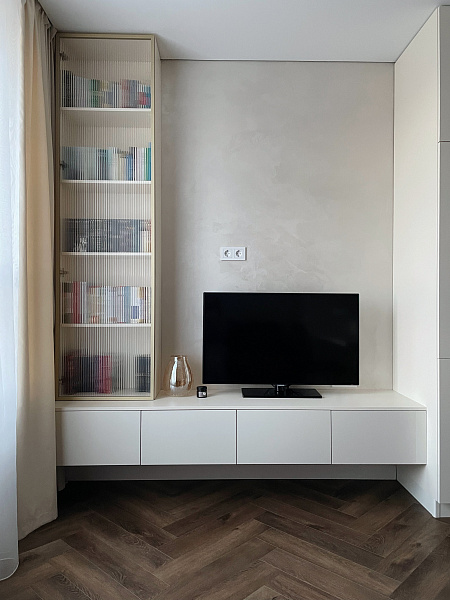 Пожеланиями заказчиков были: иметь светлое уютное пространство и разместить всё необходимое для их комфортного проживания. Площадь данного помещения -18.4 м2.