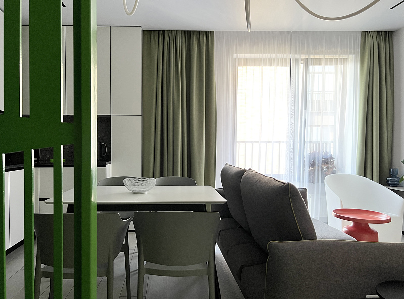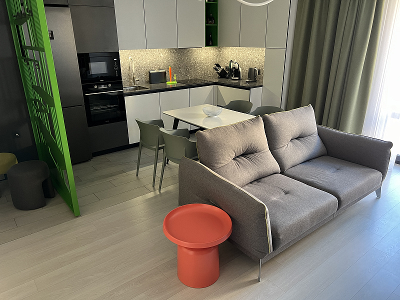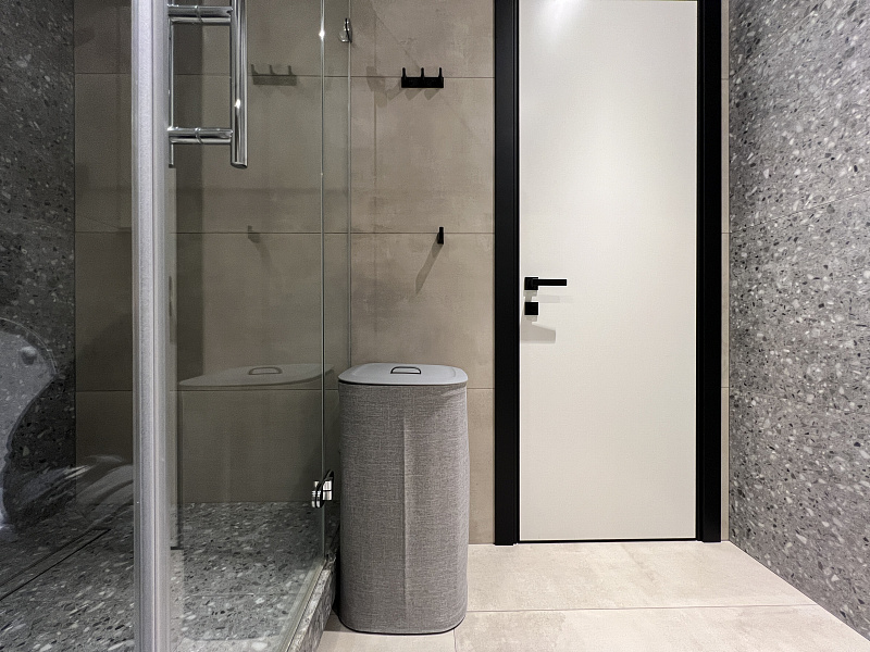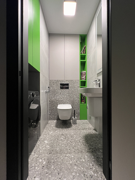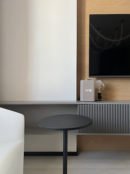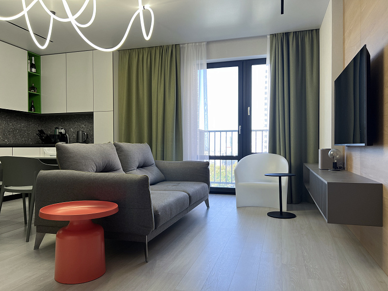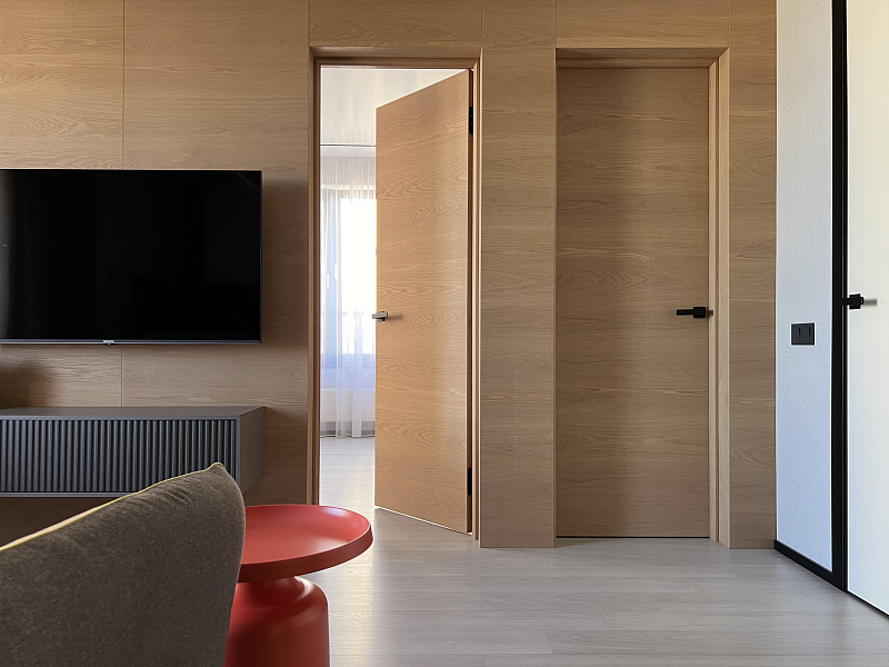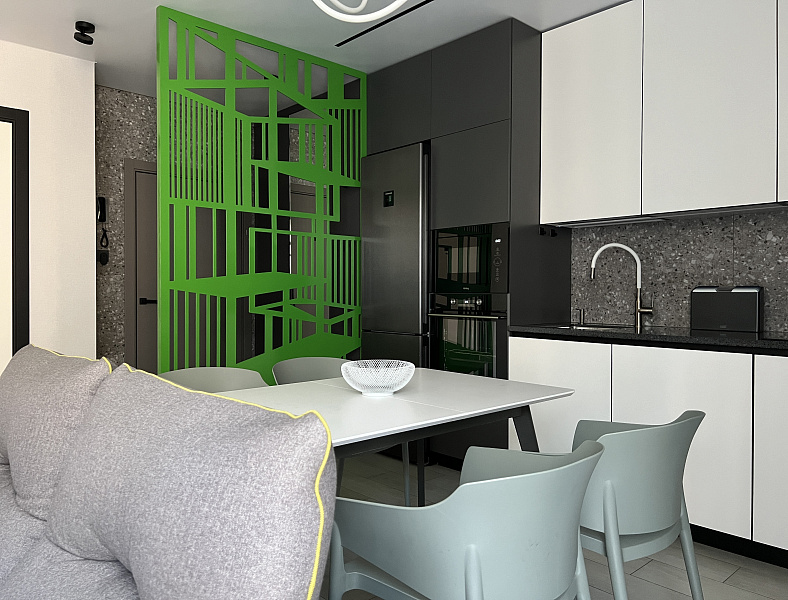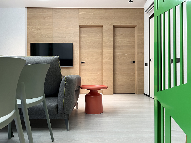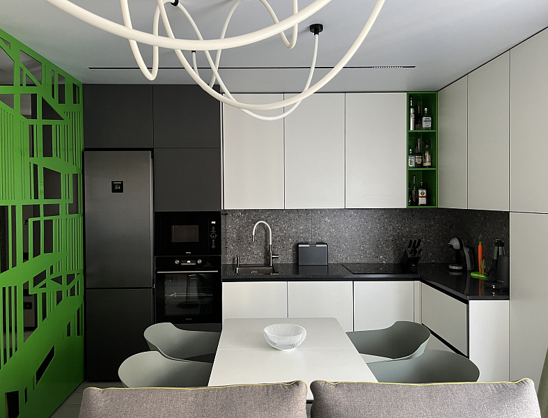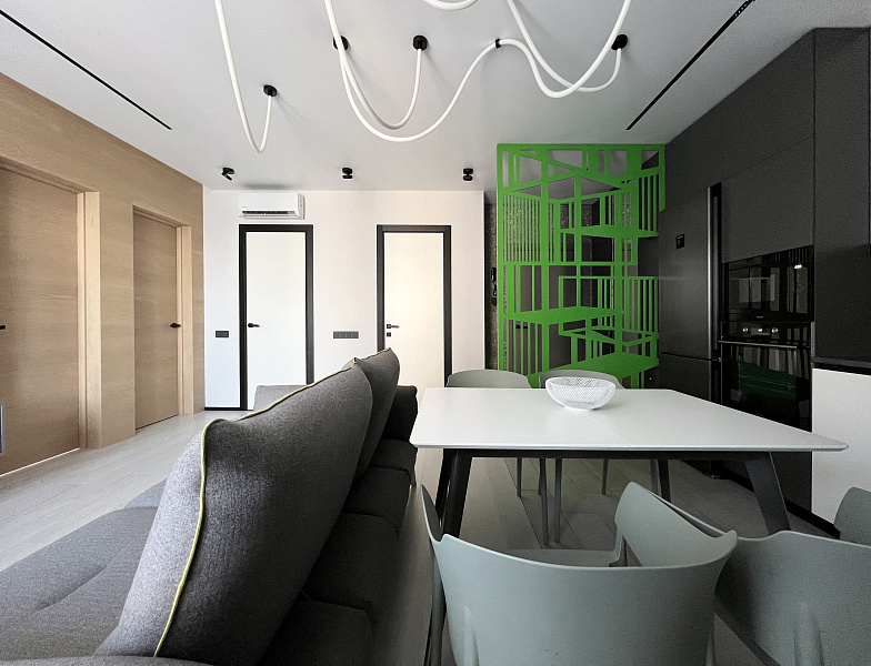 Оптимальные по функциональности и комфорту планировочные решения позволили на 65 м2 разместить кухню, гостиную, столовую, две спальни, гардеробную, мастер-санузел с душем, гостевой санузел со стиральной машиной. Цветовые решения в нейтральных оттенках серого, белого и теплого дуба делают помещение светлее и визуально больше, а яркие акценты, элементы мебели, освещения и декора создают привлекательное и запоминающееся пространство. Применяемые в интерьере материалы ENNFACE выгодно подчеркнули современный интерьер небольшой, удобной и стильной квартиры.