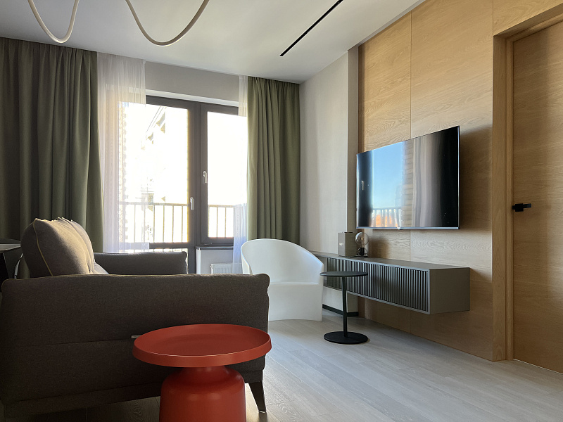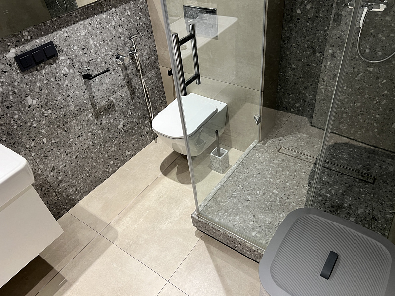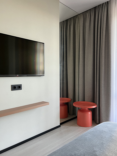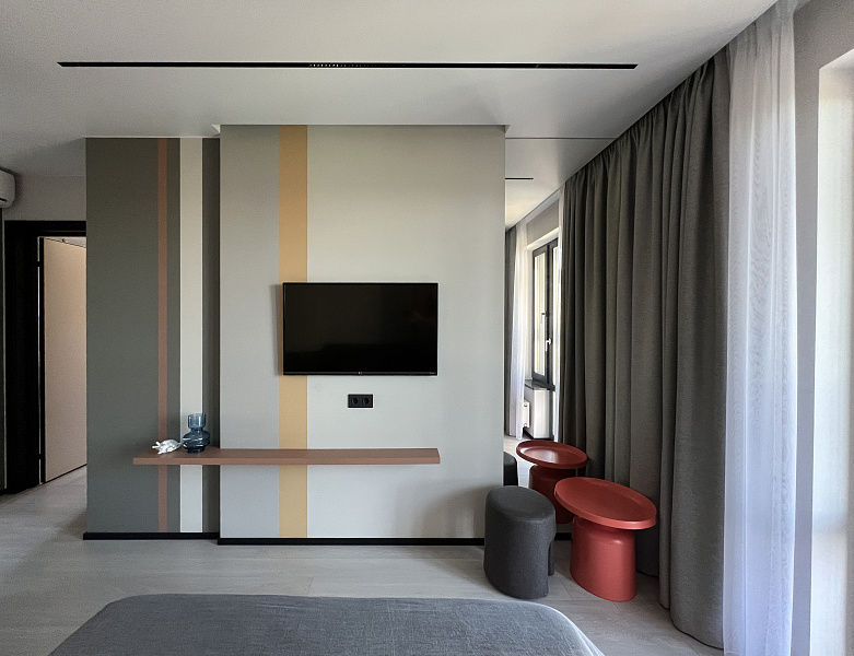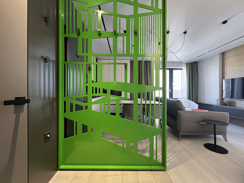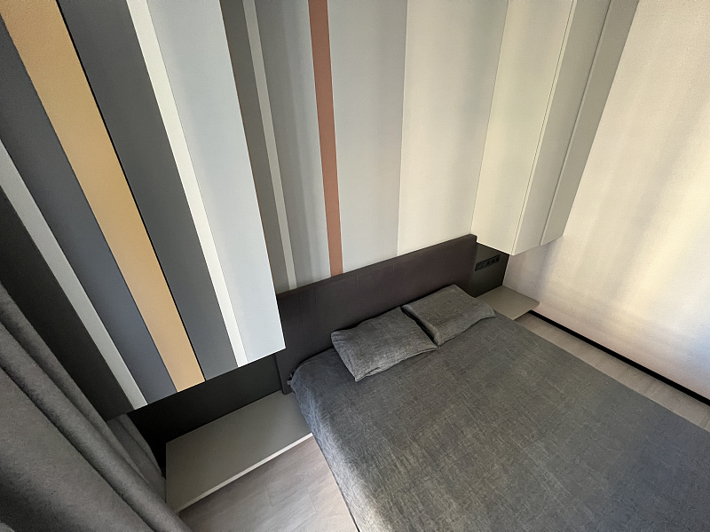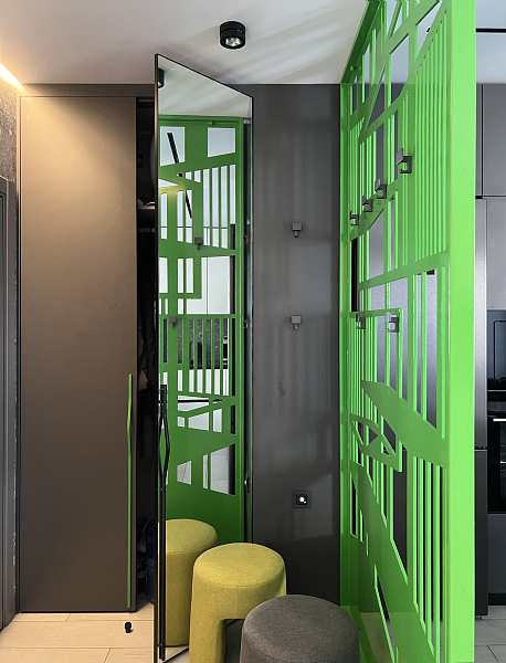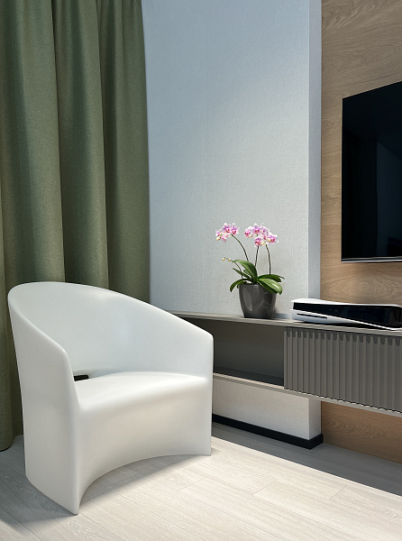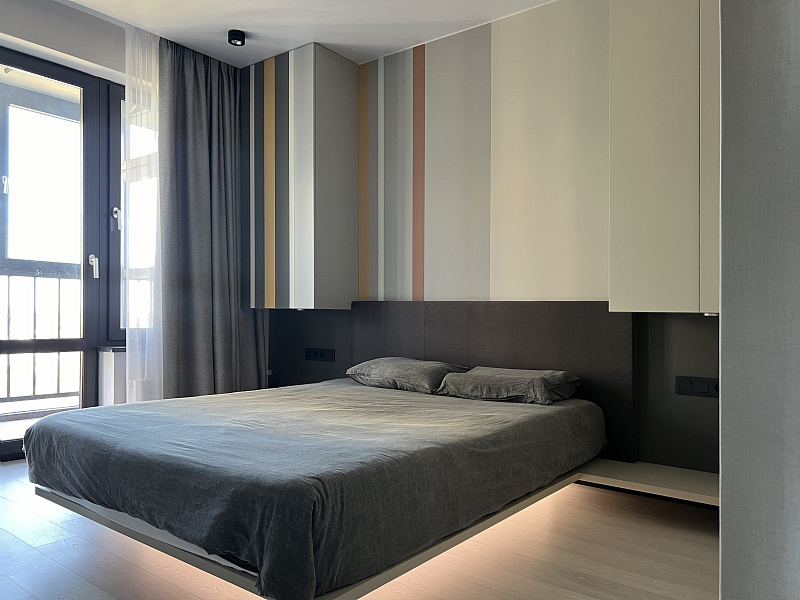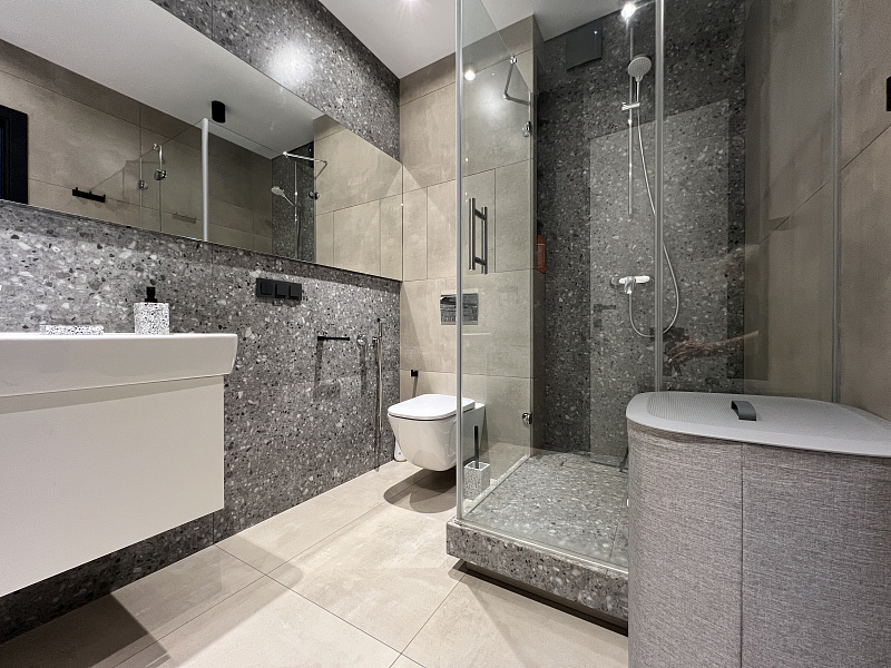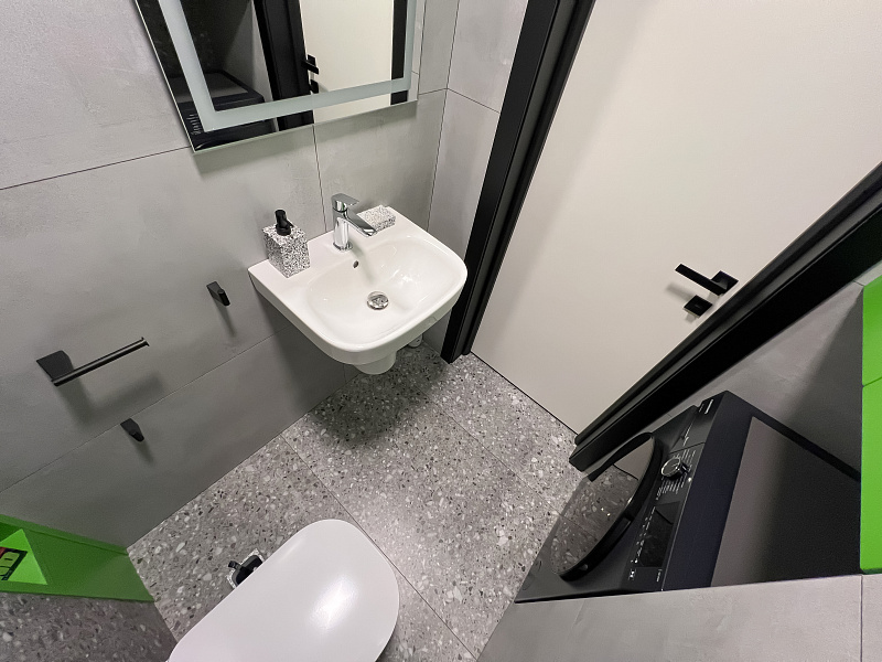 Оптимальные по функциональности и комфорту планировочные решения позволили на 65 м2 разместить кухню, гостиную, столовую, две спальни, гардеробную, мастер-санузел с душем, гостевой санузел со стиральной машиной. Цветовые решения в нейтральных оттенках серого, белого и теплого дуба делают помещение светлее и визуально больше, а яркие акценты, элементы мебели, освещения и декора создают привлекательное и запоминающееся пространство. Применяемые в интерьере материалы ENNFACE выгодно подчеркнули современный интерьер небольшой, удобной и стильной квартиры.