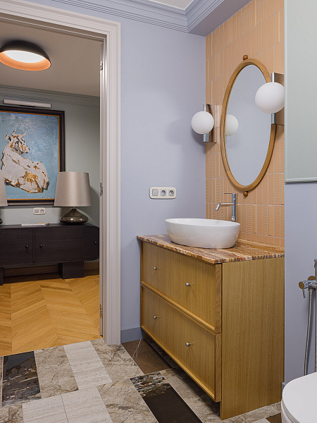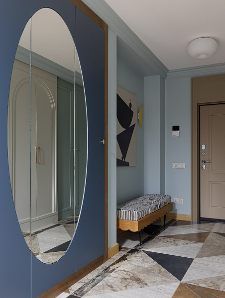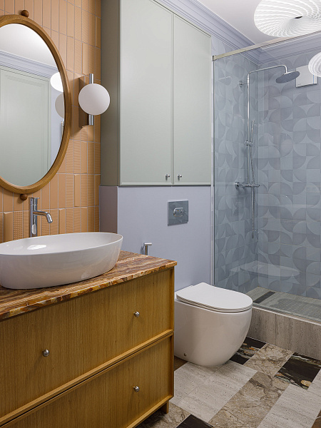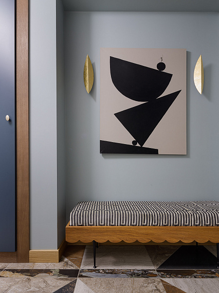 Реализованный проект квартиры. Данная квартира имеет свою особенность — это большой коридор, который необходимо было зонировать покрытием пола. На большую площадь сложно подобрать готовое решение, так для каждого помещения орнамент должен быть сомасштабен его размеру. Поэтому мы решили, что сами создадим нужный нам рисунок. За основу взяли несколько видов керамогранита ENNFACE формата 1200х600 мм и порезали его на большие треугольники из которых создали свое уникальное панно. Вдохновившись темой неповторимого рисунка мы продолжили эту историю на полу в гостевом санузле, где мы повторились в материалах, но не повторились в самой раскладке. Удивительной особенностью данного решения оказалось то, что был использован каждый см купленного керамогранита