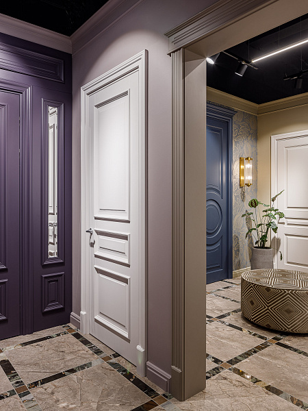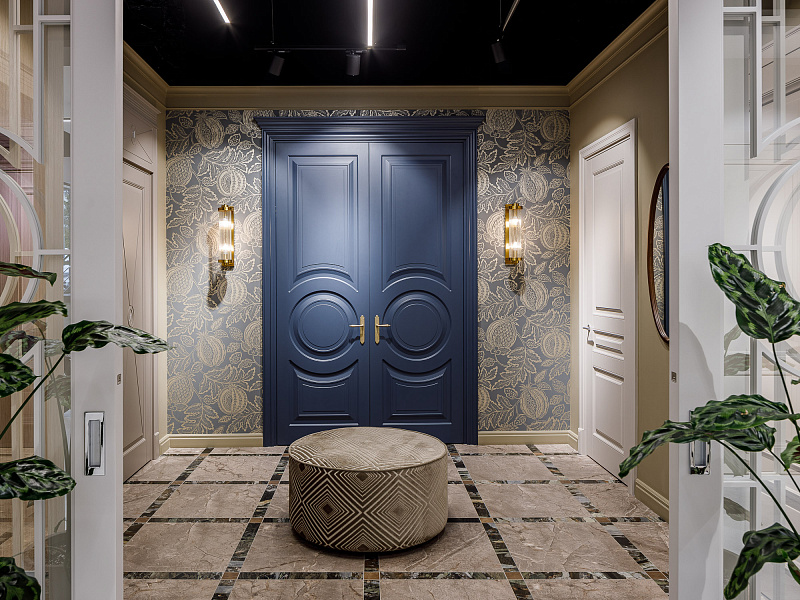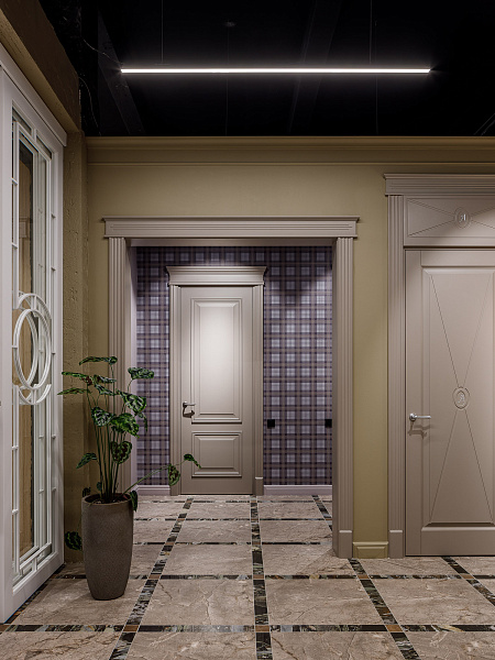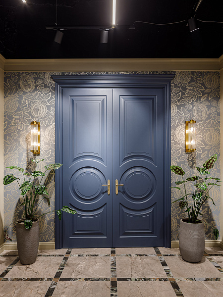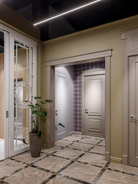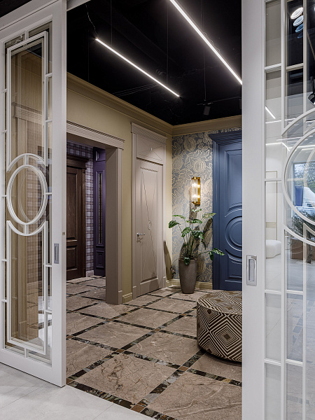 Работая над интерьером салона, нашей основной задачей было — создание пространства, раскрывающего красоту и особенность каждой двери в коллекции. Так для создания пластического контраста орнаментов — было принято решение сделать классическую раскладку пола из 3 видов керамогранита. Легко реализовывать задуманные идеи, когда работаешь с форматом керамогранита 1200х600 мм. Потому что его удобно резать и создавать элементы нужного нам размера. А большое разнообразие текстур керамогранита ENNFACE позволяет воплощать все наши уникальные задумки в жизнь.