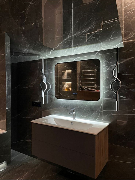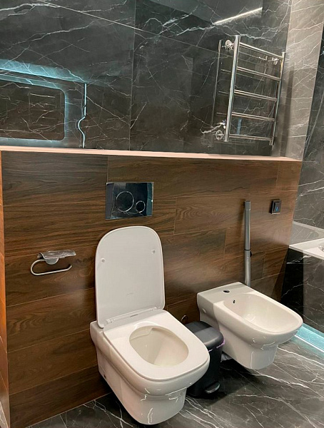 Представлен реализованный проект санузла. В темных оттенках с добавлением дерева.