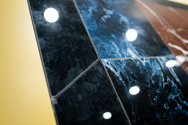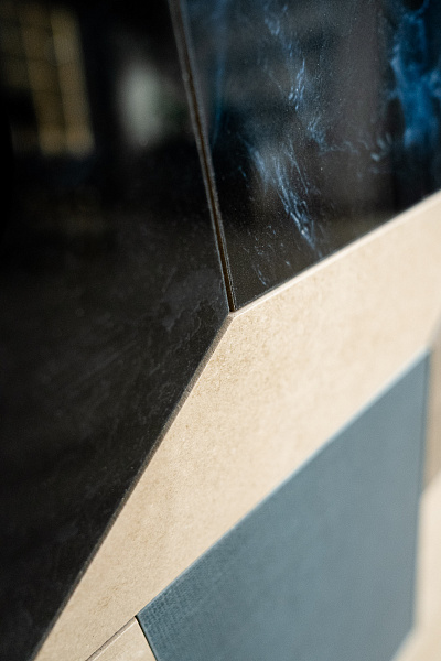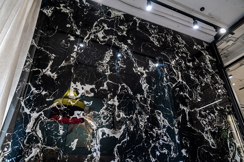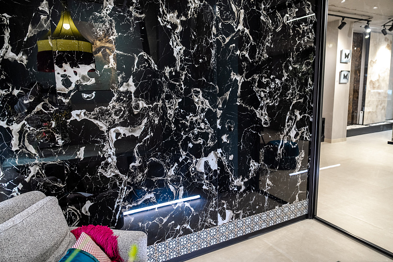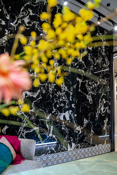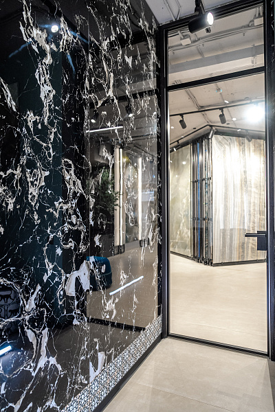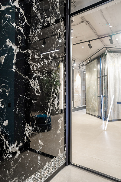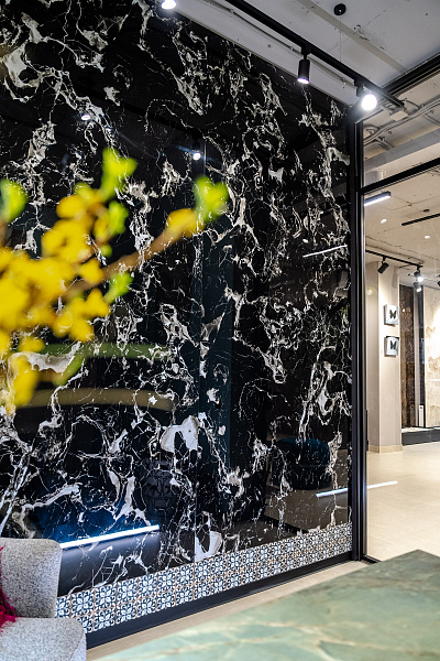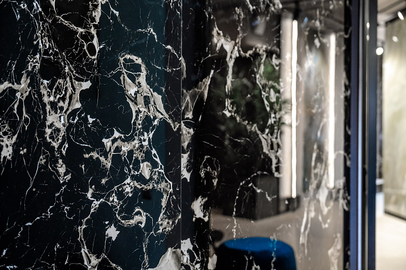 В кабинете директора в качестве акцентной стены применен керамогранит - Portoro Black 1200х2800х6 Full Lappato.