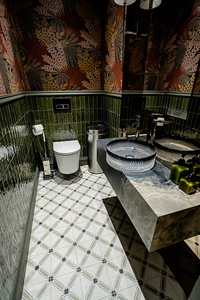 В шикарный санузел с изумрудными акцентами использовали керамогранит - Ponza Cross 200х200х8 Matt.