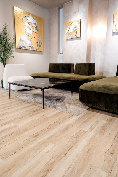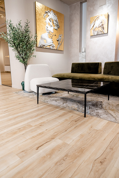 Выкладкой для основной части пола арт-пространства послужил SPC FLOORING - Country Straw 181х1220х4мм MATT.