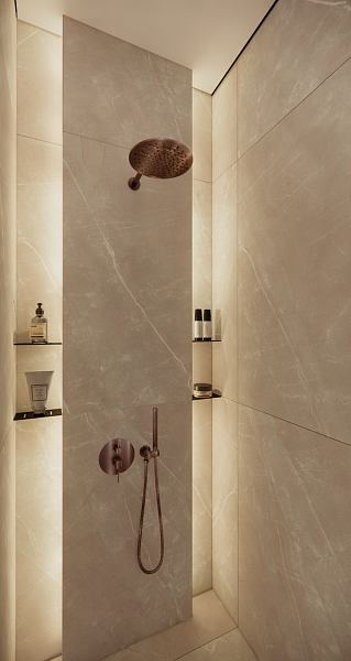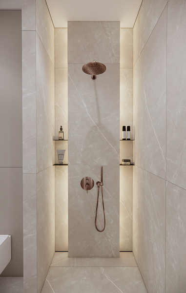 В этой плитке сочетаются серые оттенки с белыми трещинами - словно лёд. Но даже «Аляску» можно растопить, добавив тёплый свет и бронзовый металл.