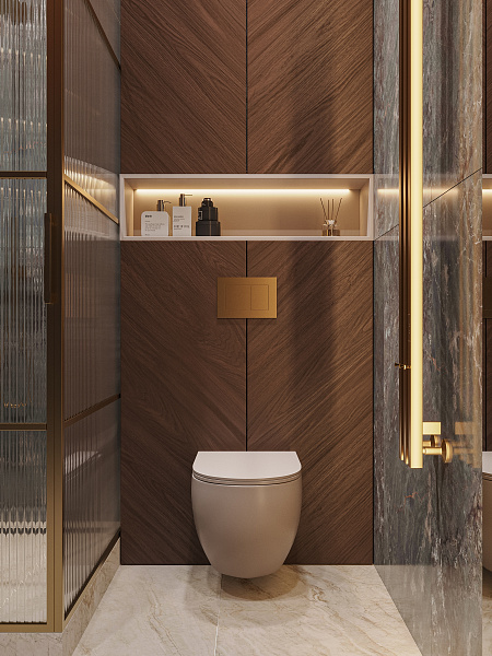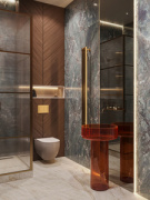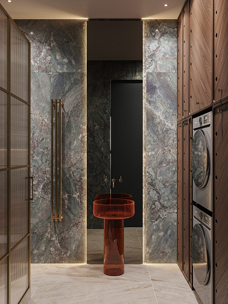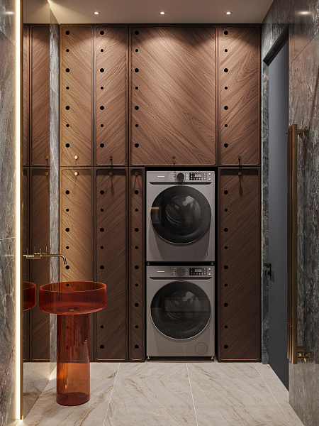 Проект называется Cranes (Журавли). Проект для взрослой пары, которая переселяется в столицу и обустраивает новый дом. Клиенту сразу же понравился дизайн. Душевая получилась мегафункциональной комнатой, так как здесь у нас и душевая, и постирочная, и унитаз, и даже красивая отдельностоящая раковина с зеркалом.