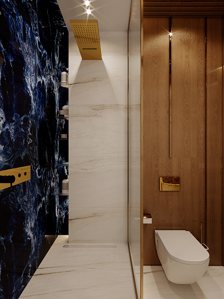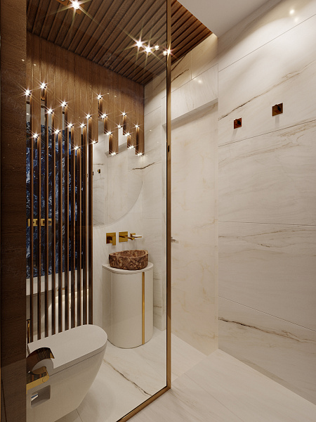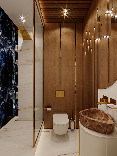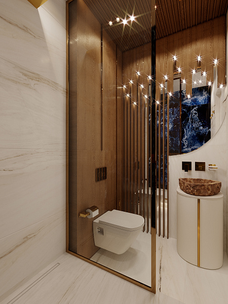 Для квартиры был выбран стиль ар-деко, и гостевой сан узел не исключение, клиентам хотелось создать ВАУ эффект, чтобы гости заходили в помещение и удивлялись! Поэтому в «компаньоны» к раковине добавились деревянные рейки с подсветкой! Проект был утвержден с первого раза.
