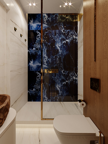 Проект «Синяя гладь» начался с выбора раковины! Клиенты очень хотели в своем проекте раковину из дерева и нужно было обыграть ее ажурность, неправильность формы. Для этого мы выбрали акцентный керамогранит Adriatic Blue 600х1200мм HIGH GLOSSY, и чтобы «усмирить» эту буйную и насыщенную текстуру, был выбран фоновый керамогранит Nexion-POMPEII-BIANCO-LASA-1.