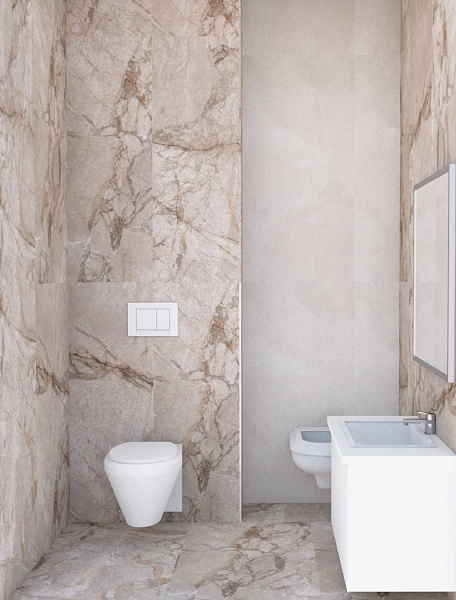 Преобладание бежевых оттенков как на полу, так и на стенах помогает визуально расширить пространство, придавая ему ощущение воздухопроницаемости и легкости. Керамогранит с матовой текстурой не только выглядит эстетично, но и обладает высокой износостойкостью, что делает его идеальным выбором для ванной комнаты.