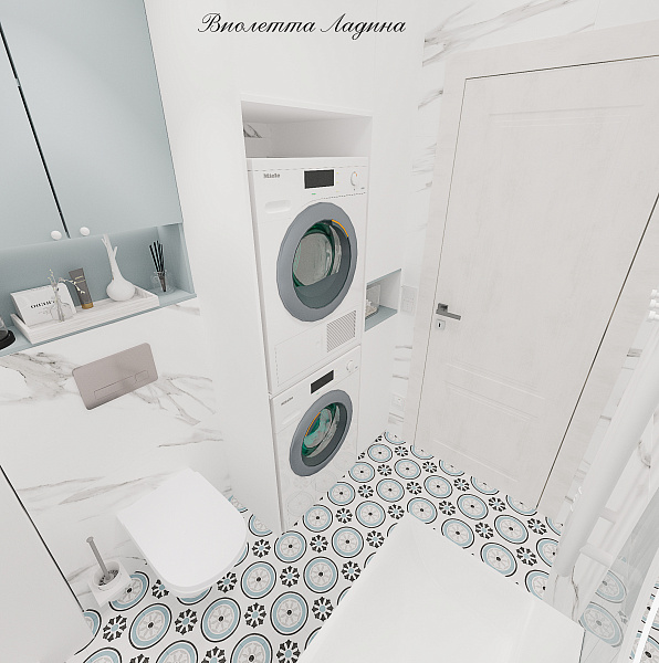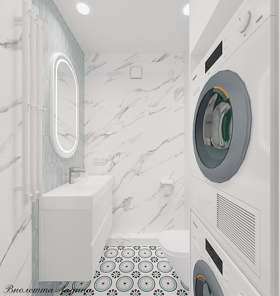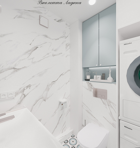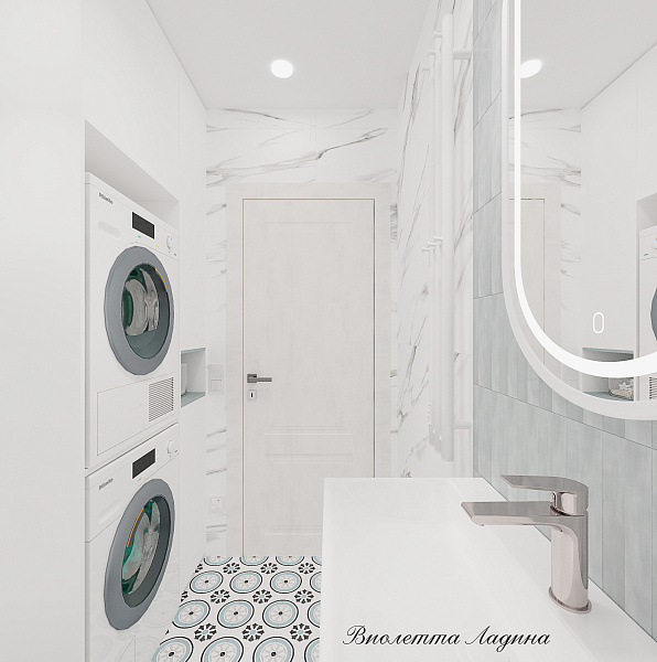 Помещение стало не каморкой, а полноценной комнатой, в которой решили следующие задачи: спроектировали инсталляцию с подвесным унитазом, умывальную зону и конечно же разместили колонну с стиральной машиной и сушильным шкафом, а также зону для сборки грязного белья и систему хранения.