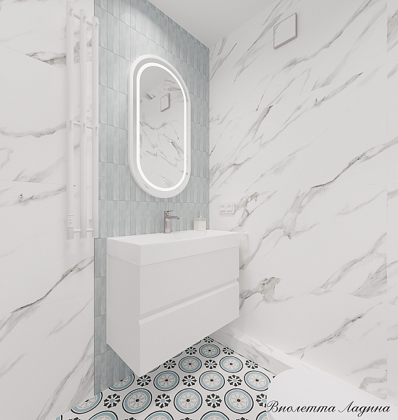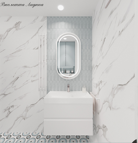 Объединили визуально санузел и душевую комнату за счет повторного использования прямоугольной серой плитки Camelot Grey 75х225х8 glossy, керамогранит ENNFACE, но уже с стандартной раскладкой в зоне раковины, белый компаньон глянцевого мрамора Arabescato White 600х1200мм Glossy, керамогранит ENNFACE добавил элегантности и роскоши этим сочетаниям. На полу игривая плитка с голубым акцентом Ponza Orchard 200х200х8 Matt, керамогранит ENNFACE, которая заключает общую картинку текстур в единое целое.