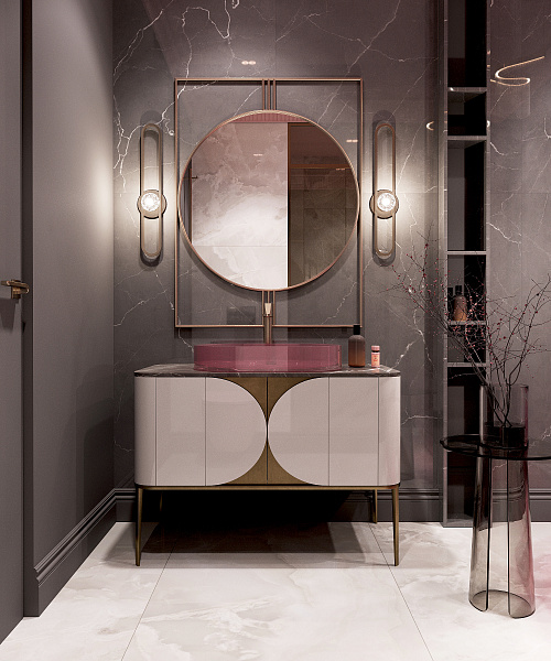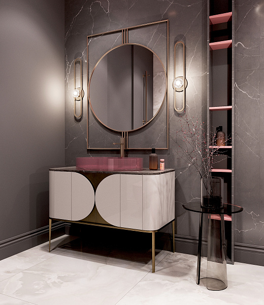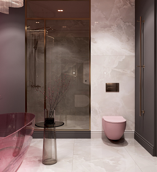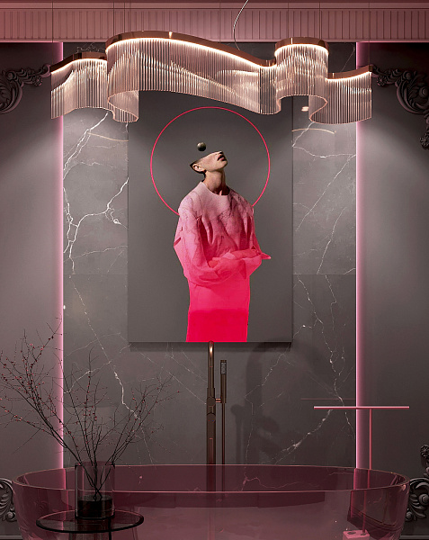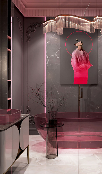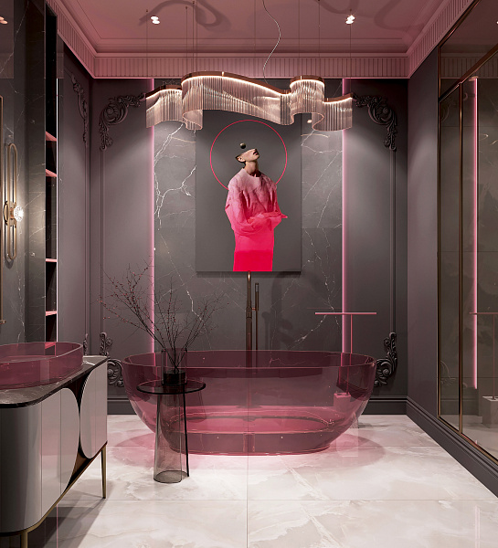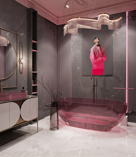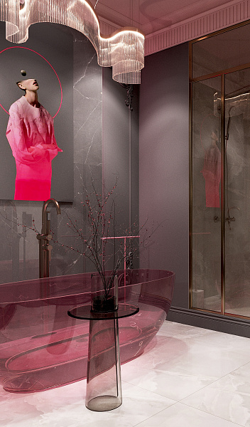 Стильная ванная комната для смелых, экстравагантных и неординарных персон. Решена в глубоких, насыщенных оттенках серого, с яркими акцентами розового. Просто бомбическое, беспроигрышное сочетание цветов и текстур. Центром композиции является прозрачная ванна, с эффектной, струящейся, как волна, люстрой. Помимо основного освещения, присутствует дополнительный свет, более мягкий и спокойный, с розовым свечением, для релакса и полного расслабления. В качестве контраста, на полу и частично на стенах, в мокрых зонах, применен крупноформатный керамогранит ENNFACE: