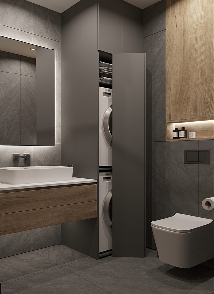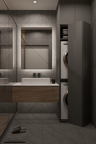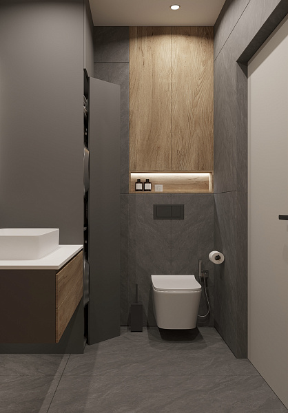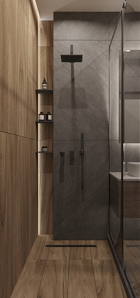 Дизайн-проект ванной комнаты в интерьере жилого помещения. Запрос клиента на темную ванную с добавлением текстуры дерева.