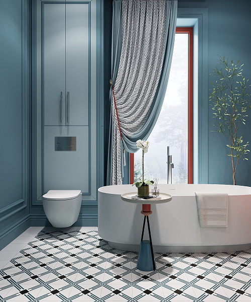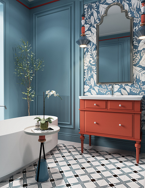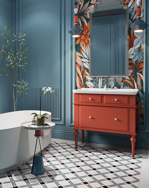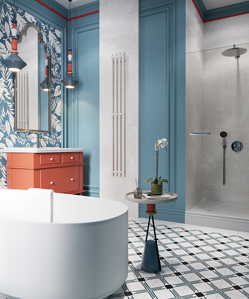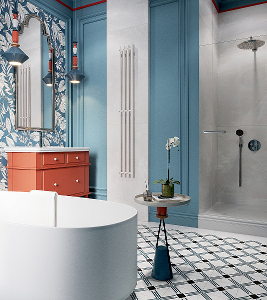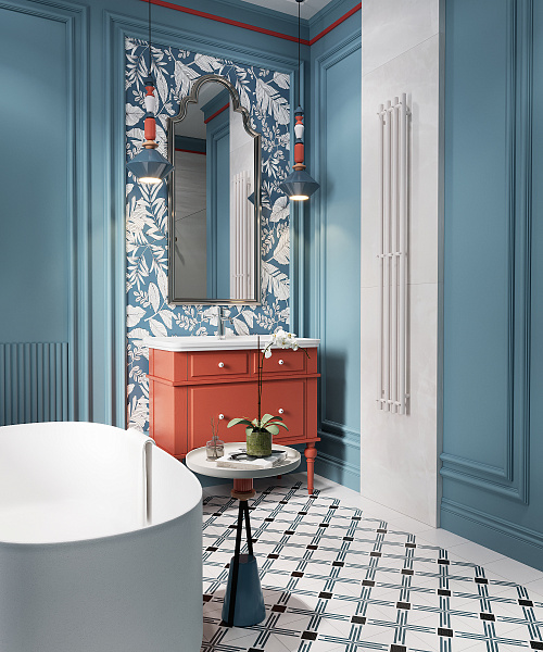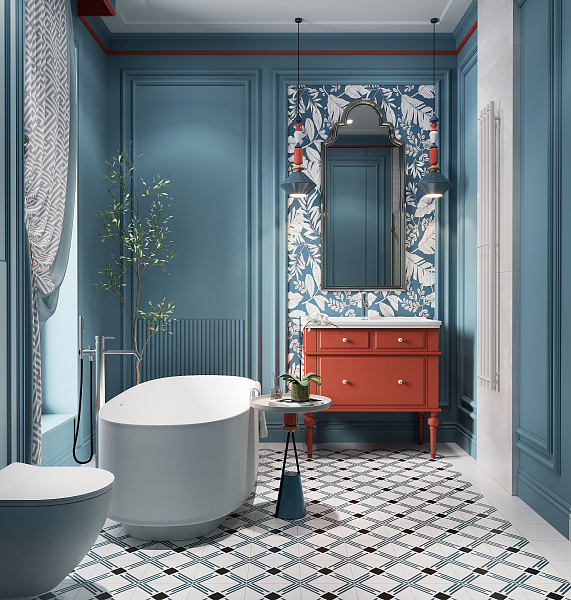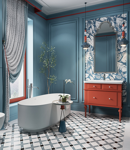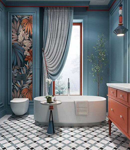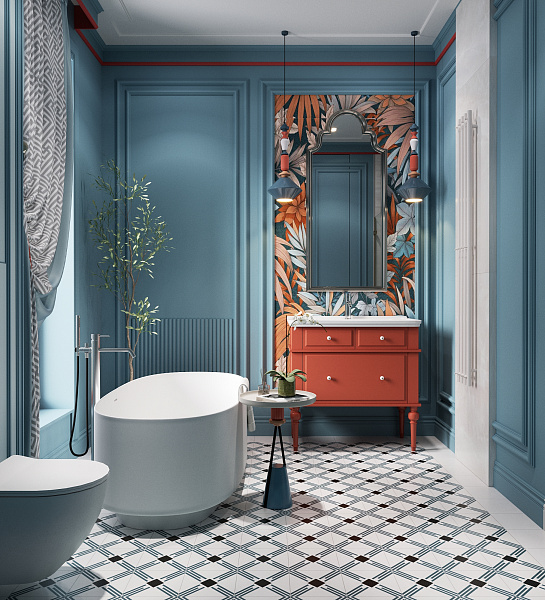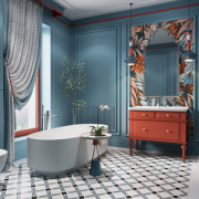 Сочный, яркий, по цветовому решению получился интерьер ванной комнаты.