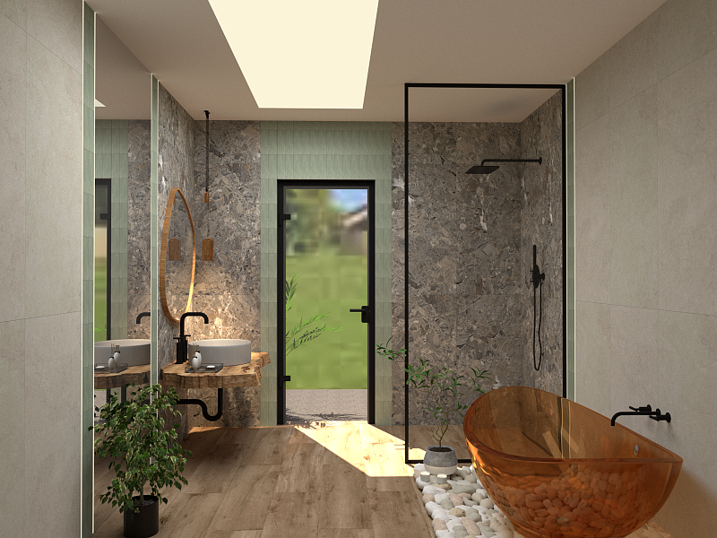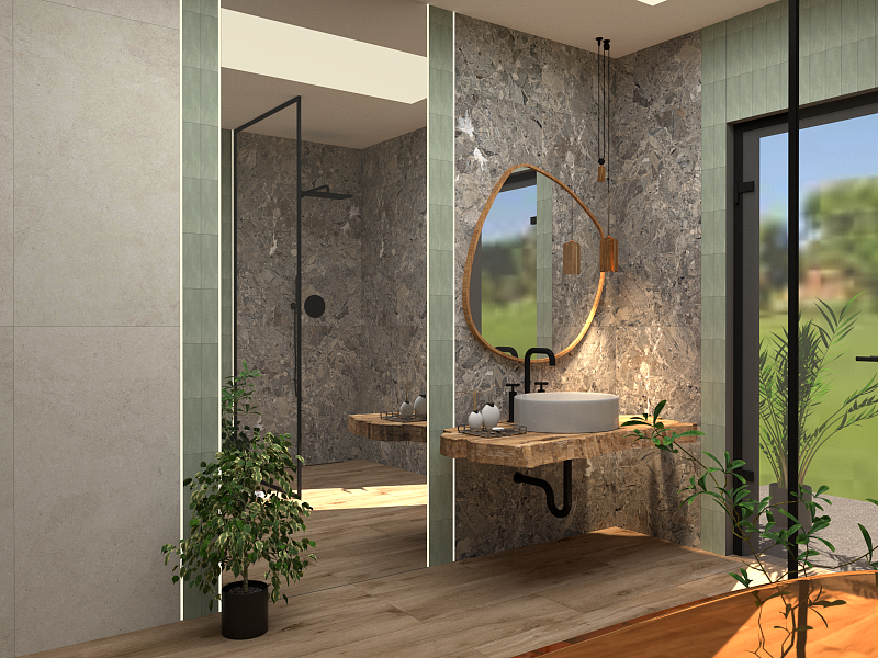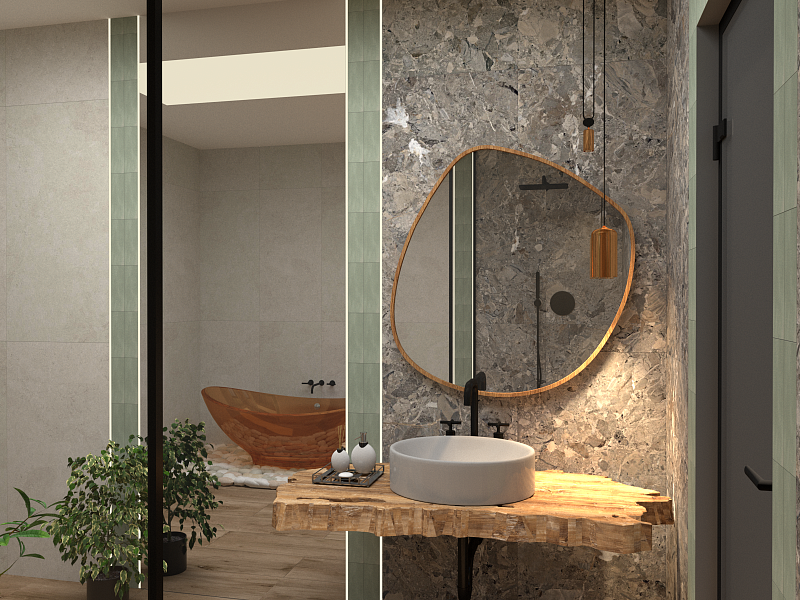 Этот проект ванная комната в частном доме с выходом на задний двор, в котором могу быть бассейн и лаундж-зона. Приятные природные фактуры дерева и камня — отлично сочетаются с зелеными оттенками и оранжевым стеклом, как будто добавляет солнышка и уюта.