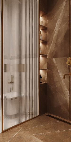 В качестве акцента в зоне душа использован шоколадный глянцевый керамогранит - ENNFACE Armani Bronze 600х1200мм High glossy