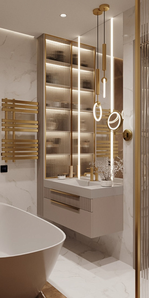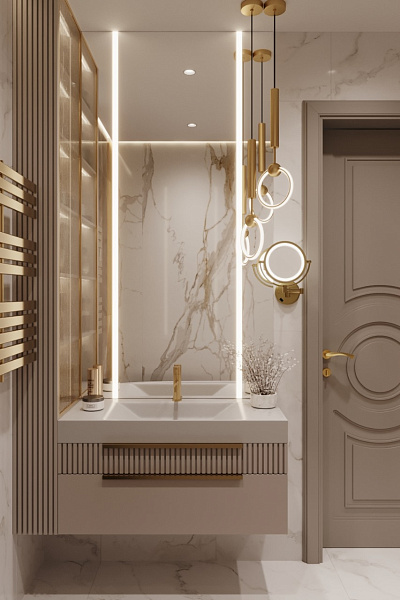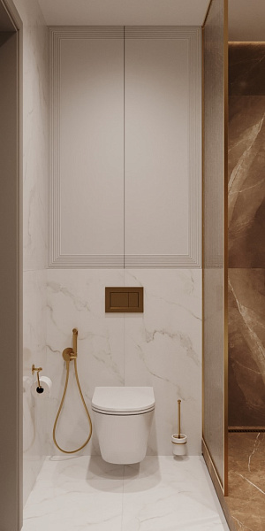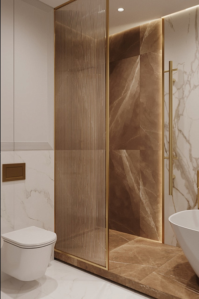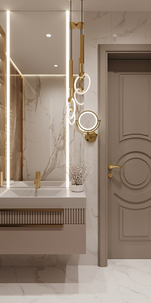 На визуализации представлен санузел 6,3 кв.м. для хозяев квартиры, который на данный момент находится на этапе активной реализации. По желанию хозяйки разместили и душ, и отдельностоящую ванну, а также инсталляцию и раковину с зеркалом в потолок. Весь интерьер выполнен в стиле неоклассика. Санузлы не стали исключением.