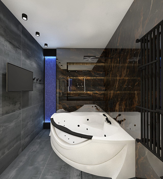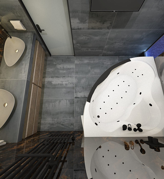 Ванная в проекте "Эффект Полуночи" создана для отдыха и расслабления после рабочего дня. Использование пузырьковой панели и керамогранита из коллекции Isla Grande были основными пожеланиями заказчиков. А сочетание этого всего с керамогранитом Oxido Grey сделало интерьер очень современным и стильным.