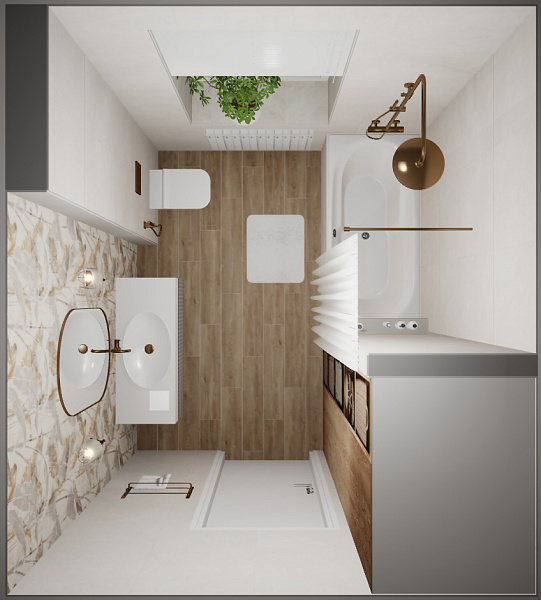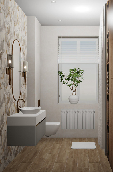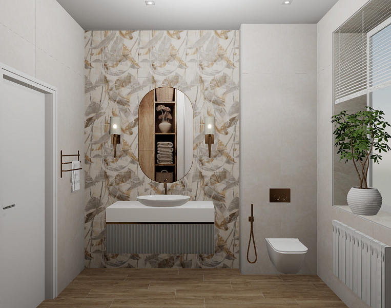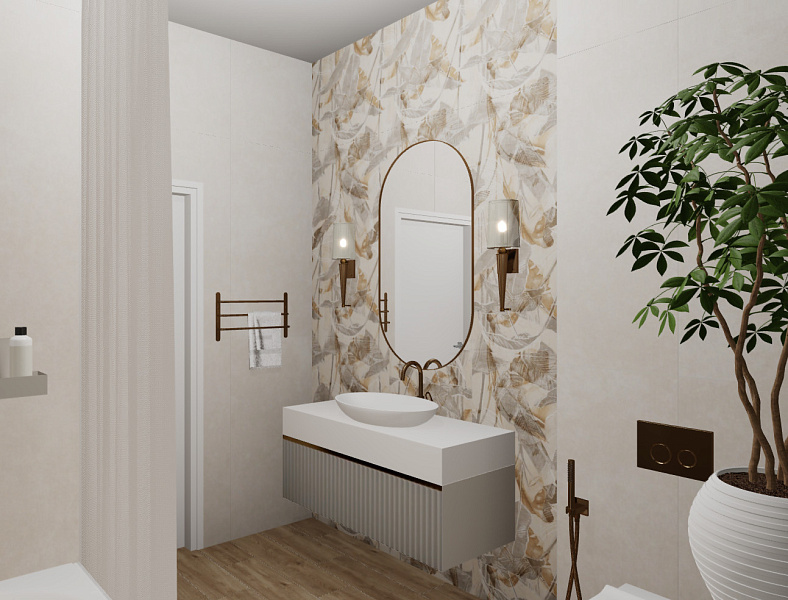 Дизайн ванной комнаты для женщины. С недавнего времени живет в городе, но очень скучает по своему небольшому поселку и видам природы. В интерьере присутствует керамогранит Martinique 600х1200мм GLU с элементами растительности.