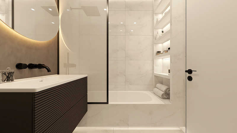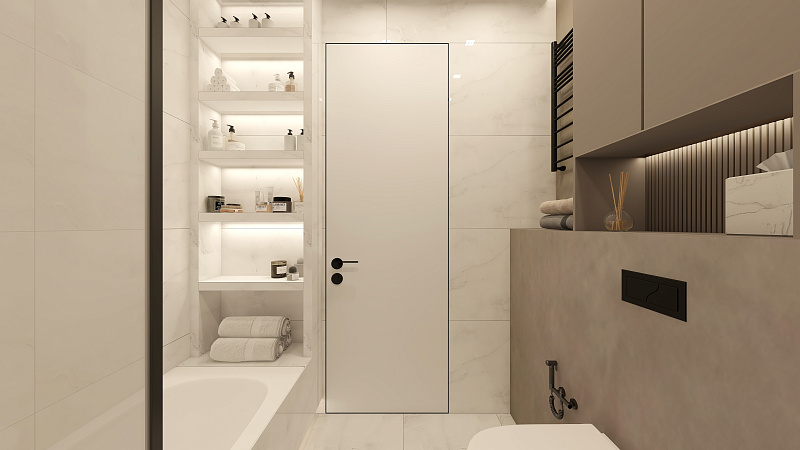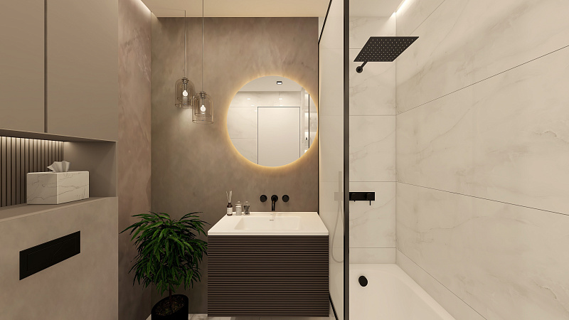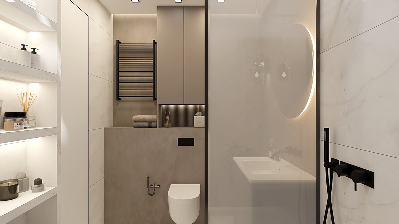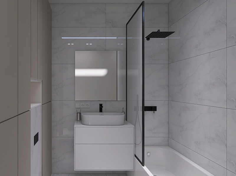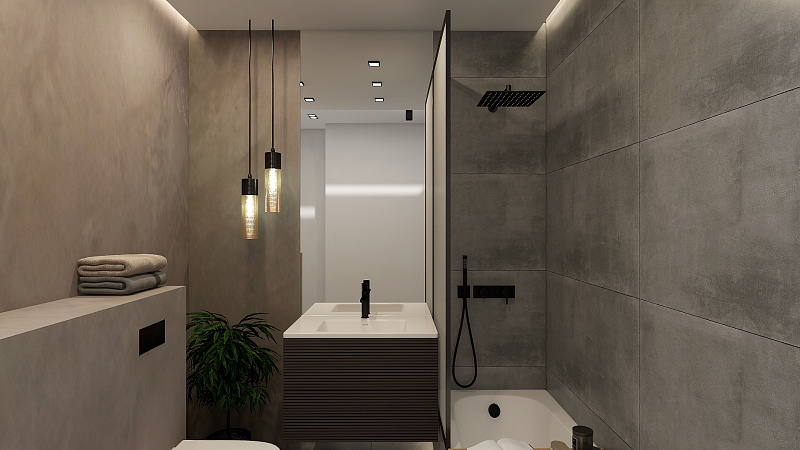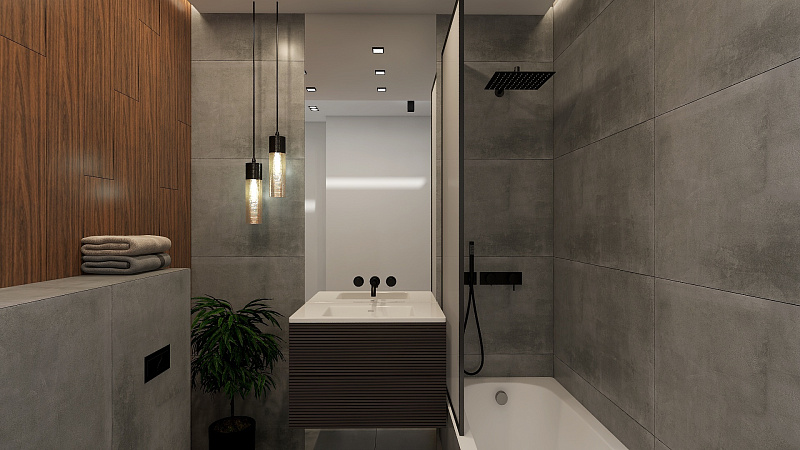 В этом проекте в исходной планировке слишком много места уделили коридору, 14 кв. м. это очень много. Было принято решение вынести хозблок со стиральной машиной в коридор, в санузле оставили все самое необходимое. Заказчица никак не могла определиться чего по истине хочет, рассматривали сочетание серых оттенков в сочетании с деревом, светлую классику, минимализм в бетоне и микроцементе, по этой причине на визуализацию попало 4 варианта. Но теперь есть точное решение, в котором наша заказчица уверена и будет чувствовать себя комфортно.