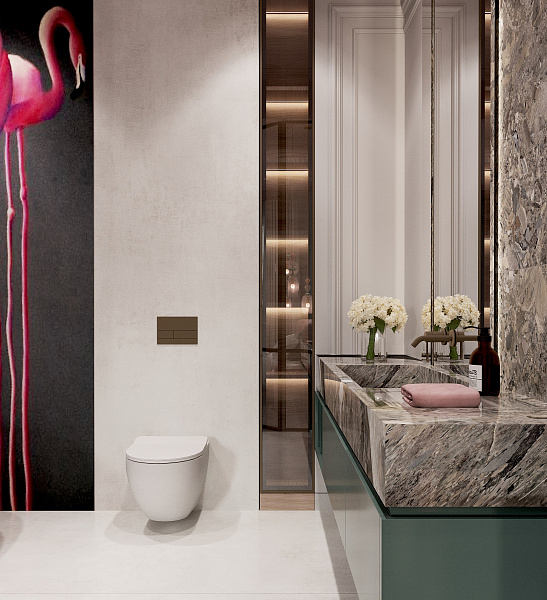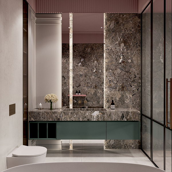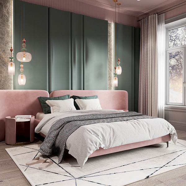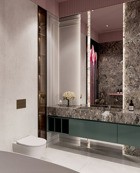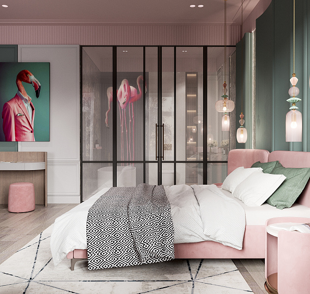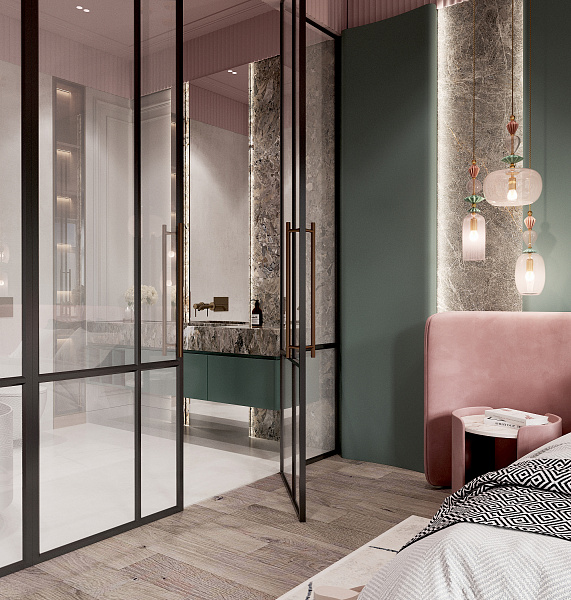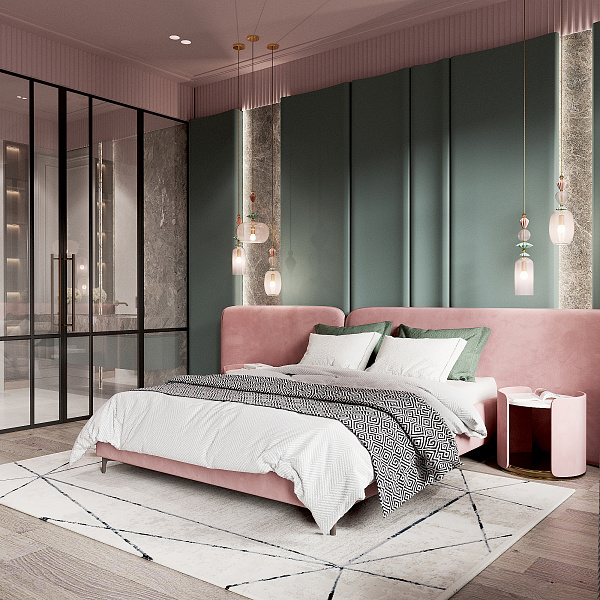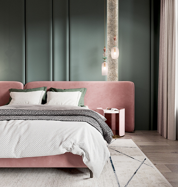 Это природное сочетание глубоких оттенков зеленого, цвета тропических растений, мха, травы и розового фламинго, в большинстве случаев такая гамма, будет смотреться интересно и свежо. Палитра таких насыщенных зеленых тонов прекрасно сочетается с розовым: нежным и ярким, теплым и холодным. В качестве дополнения и акцента, у изголовья кровати, применен крупноформатный керамогранит под камень, Lithic Gabbro Sfumato.