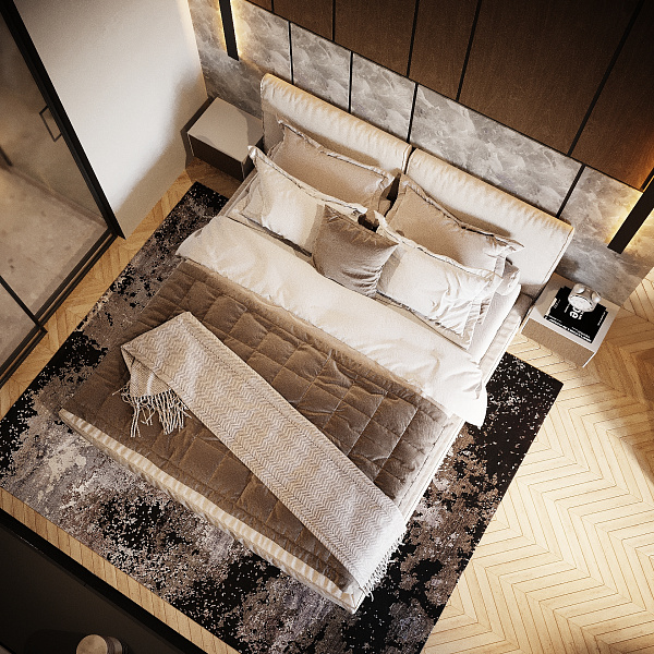 Стены, также оформленные светлым керамогранитом, создают впечатление лёгкости и простора. Нежные оттенки подчеркивают поверхность и делают акцент на геометрических линиях, образованных елочкой на полу. Дополняя оформление, выбор текстиля для штор и постельного белья осуществляется с акцентом на мягкие, натуральные тона, что превращает спальню в уголок для отдыха.